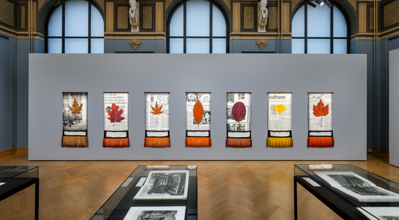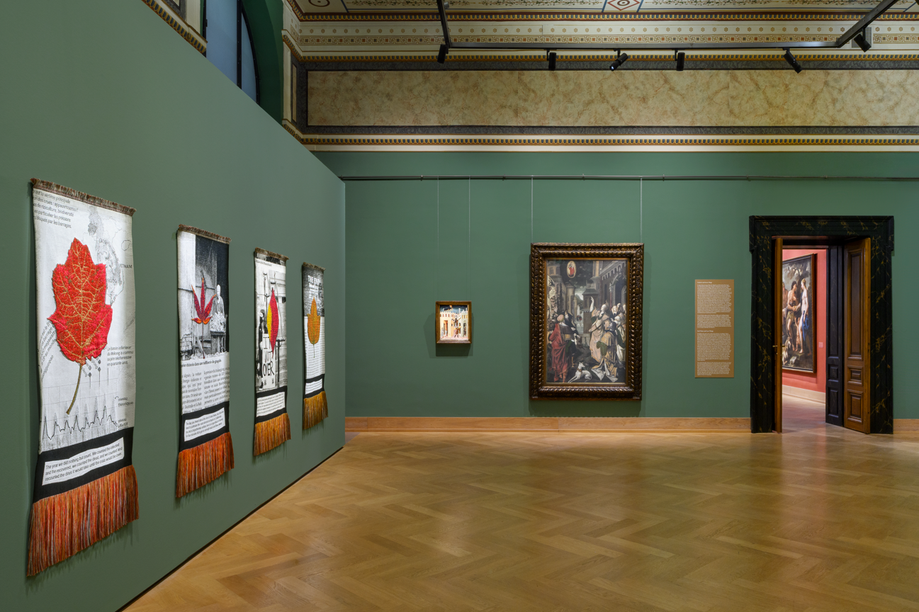Kunstenaar Ana Torfs realiseerde met ‘The Day You Were Thinking About the Sibyl While You Were Picking Autumn Leaves’ een monumentale installatie van 28 Jacquard-geweven wandkleden. Tijdens de covid-pandemie verzamelde Torfs tijdens haar wandelingen felgekleurde herfstbladeren. Dit deed haar denken aan de ‘Cumaeïsche Sibyl uit Vergilius’ Aeneis, het beroemde Latijnse epos waarin zij haar profetieën op bladeren schreef. Torfs droogde de bladeren tussen de pagina’s van internationale kranten, fotografeerde de composities en vertaalde ze naar textiel. Elk wandkleed toont een geweven blad boven een krantenartikel, aangevuld met persoonlijke en poëtische teksten.