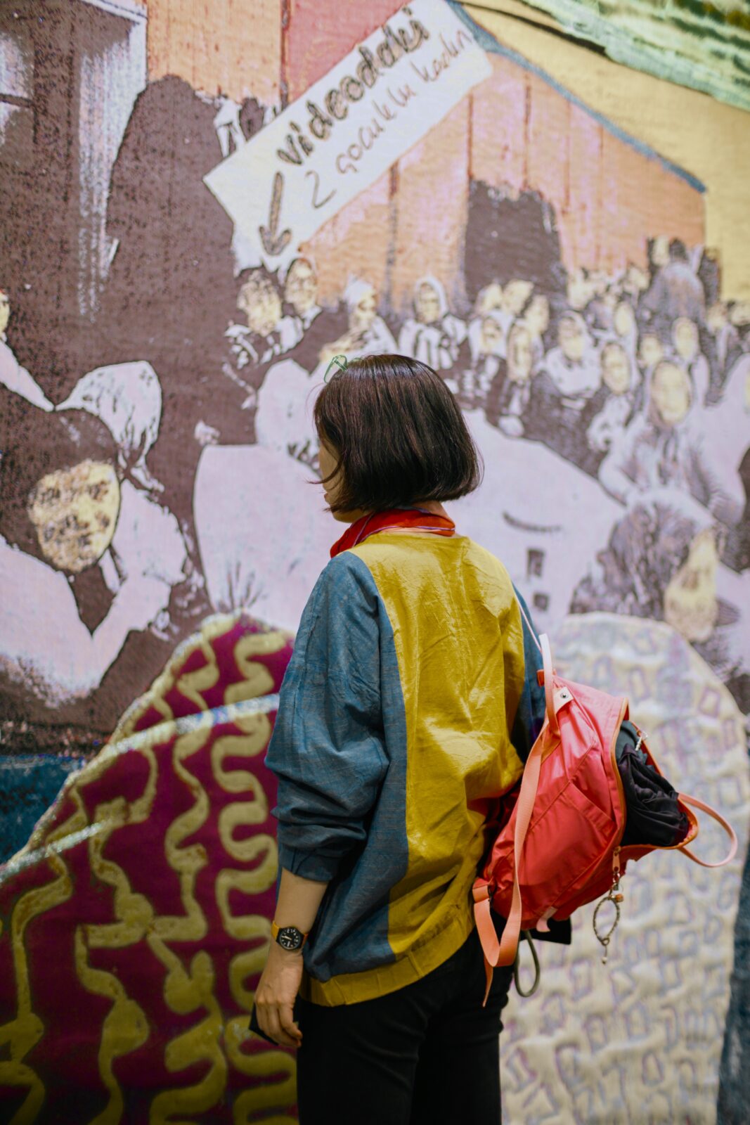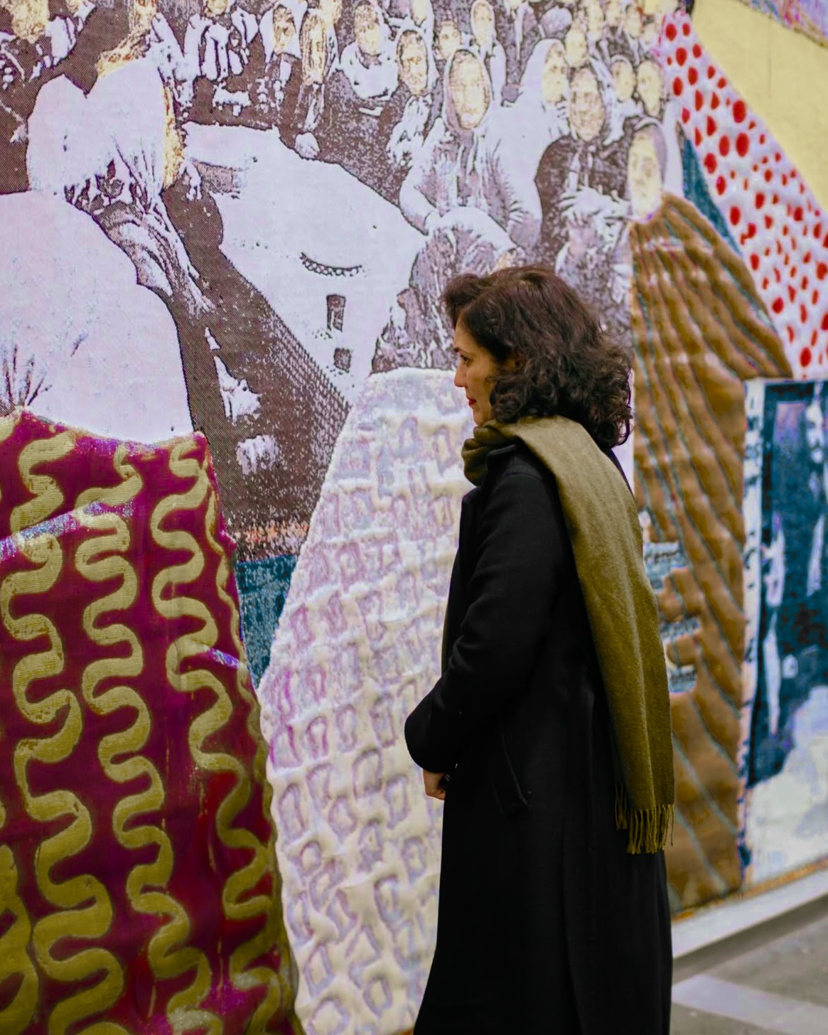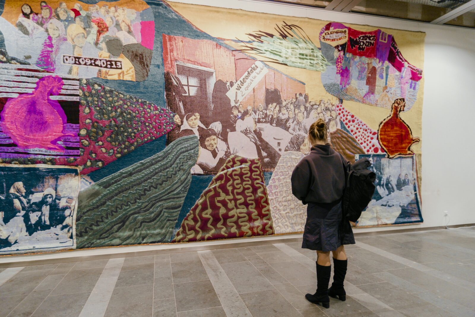 In haar solotentoonstelling ‘Remembering Otherwise’ presenteerde de Turkse kunstenaar Belit Sağ een monumentaal Jacquard-geweven wandtapijt waarin archiefonderzoek wordt vertaald naar een tactiele en visuele vertelling. Het 7 meter bij 3,5 meter grote werk brengt gefragmenteerd archiefmateriaal samen rond een arbeidsconflict uit 1978 in Veghel, waarbij vrouwelijke werknemers met een migratieachtergrond uit Turkije betrokken waren. Saǧ verwijst met haar keuze voor textiel naar de Turkse wandtapijttraditie en sluit aan bij het repetitieve, lichamelijke werk van het uien pellen dat de vrouwen destijds verrichtten. Door het intensieve weefproces weerspiegelt zij die fysieke arbeid en geeft de vrouwen opnieuw een stem.