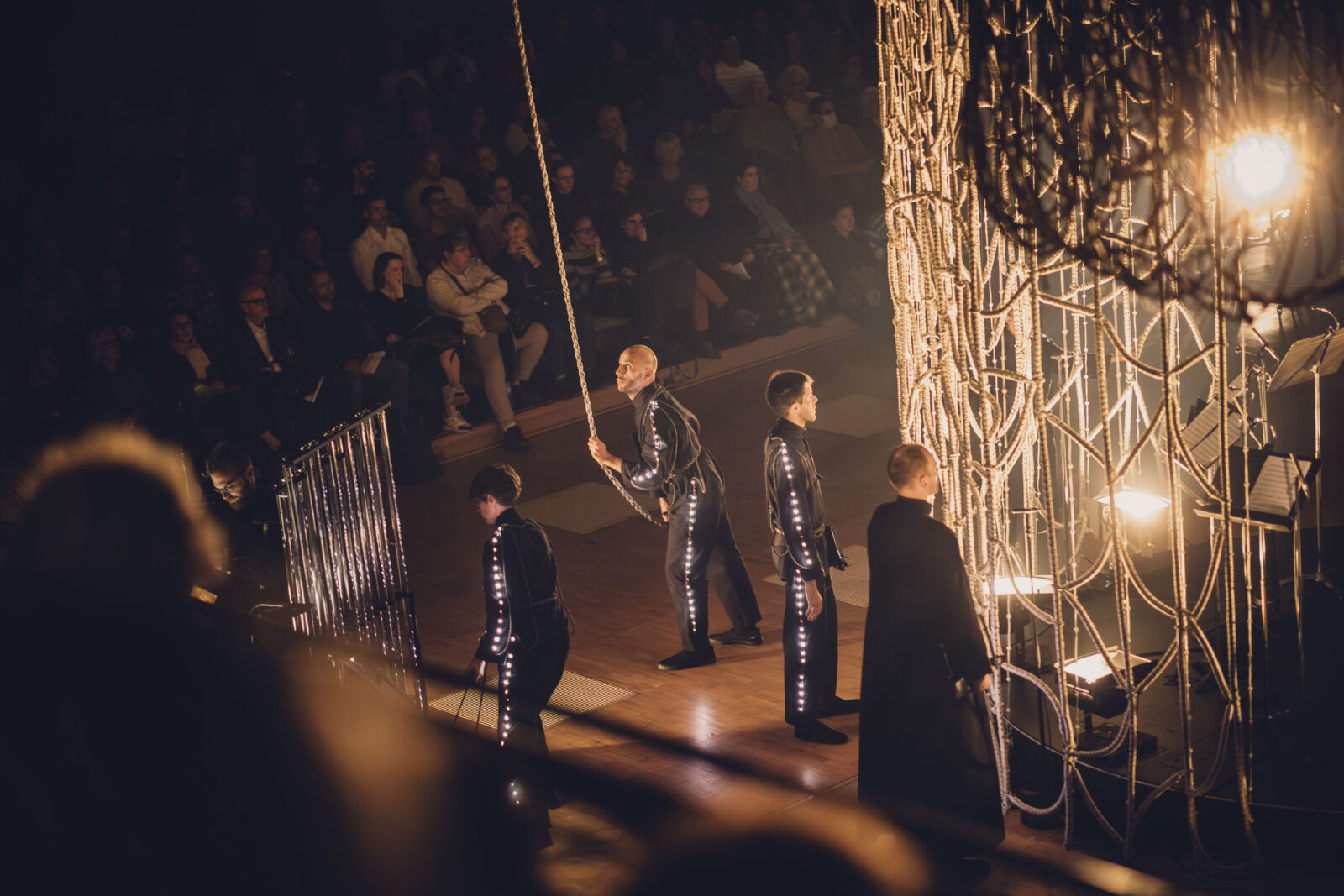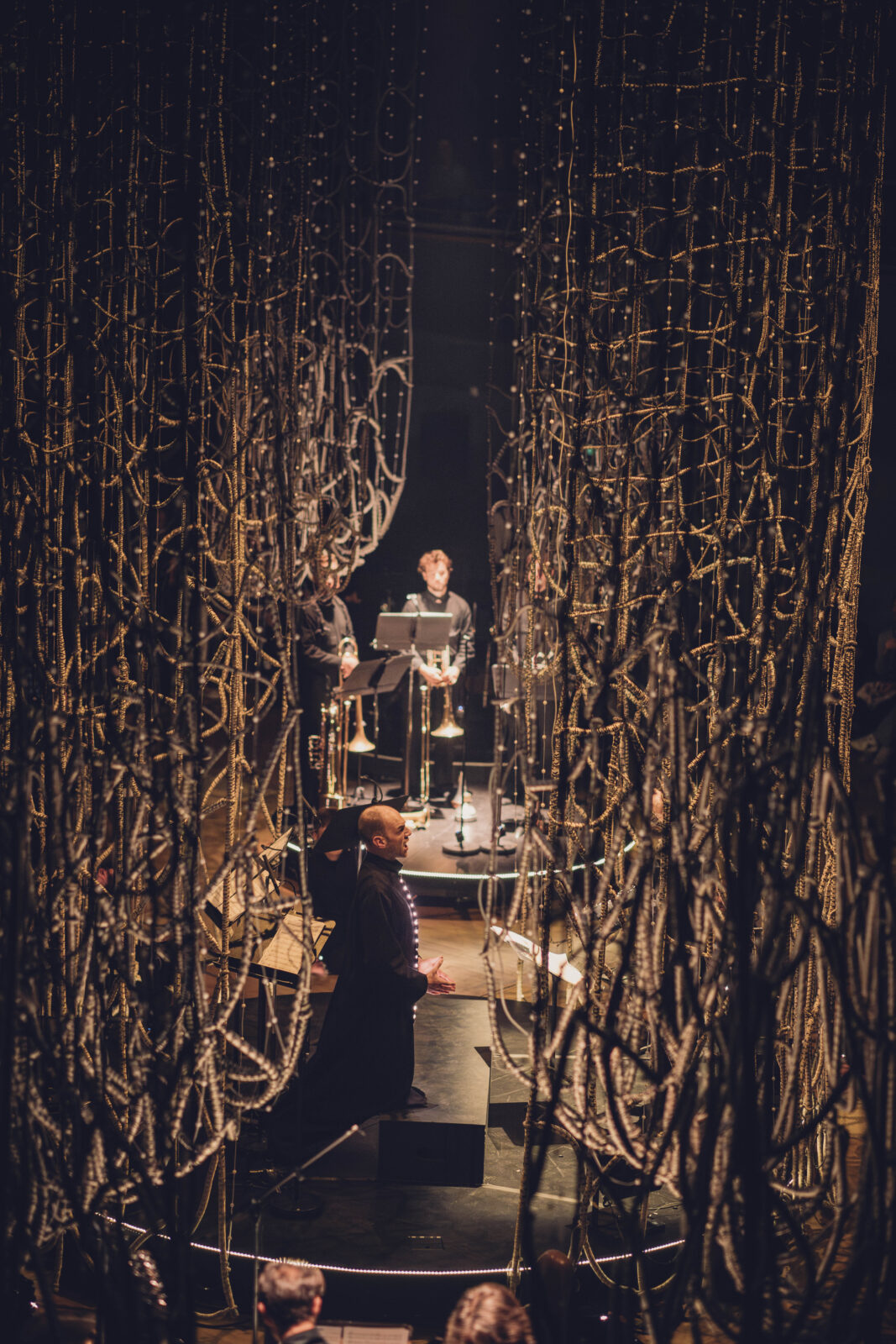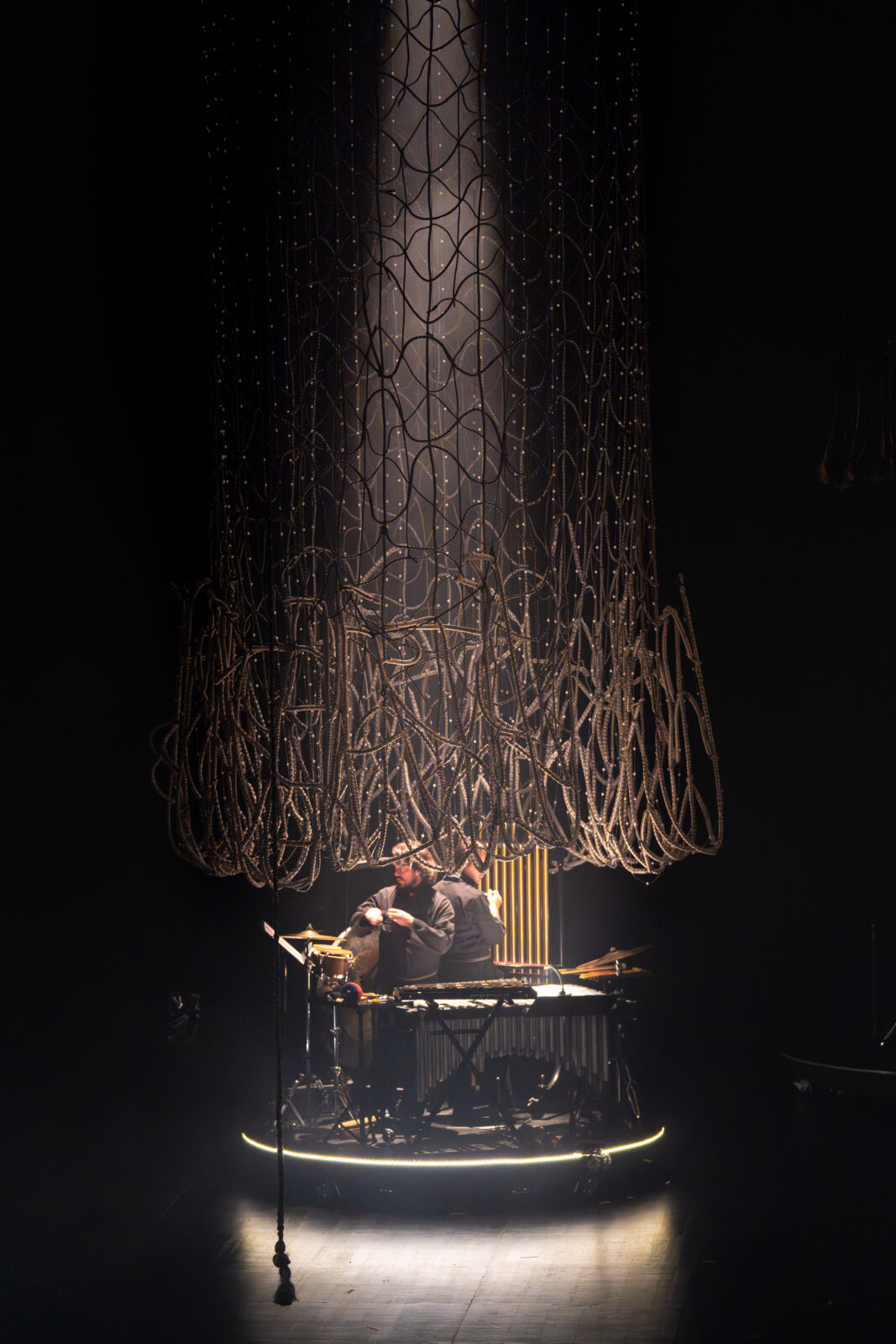 Voor Obsession ontwierp Chloé Bensahel een grootschalige textiele scenografie waarin herhaling, licht en beweging centraal staan. Het decor bestaat uit zes open grid-gordijnen van passement, met een kleurverloop van diepzwart naar metallic garens. Door de variërende dikte van de structuur – van 1 cm bovenaan tot 3 cm onderaan – krijgen de gordijnen een subtiele verbreding en een sterke ruimtelijke werking. Tijdens de voorstelling lichten LED-bronnen het metallic garen op, waardoor het textiel actief reageert op muziek en beweging.