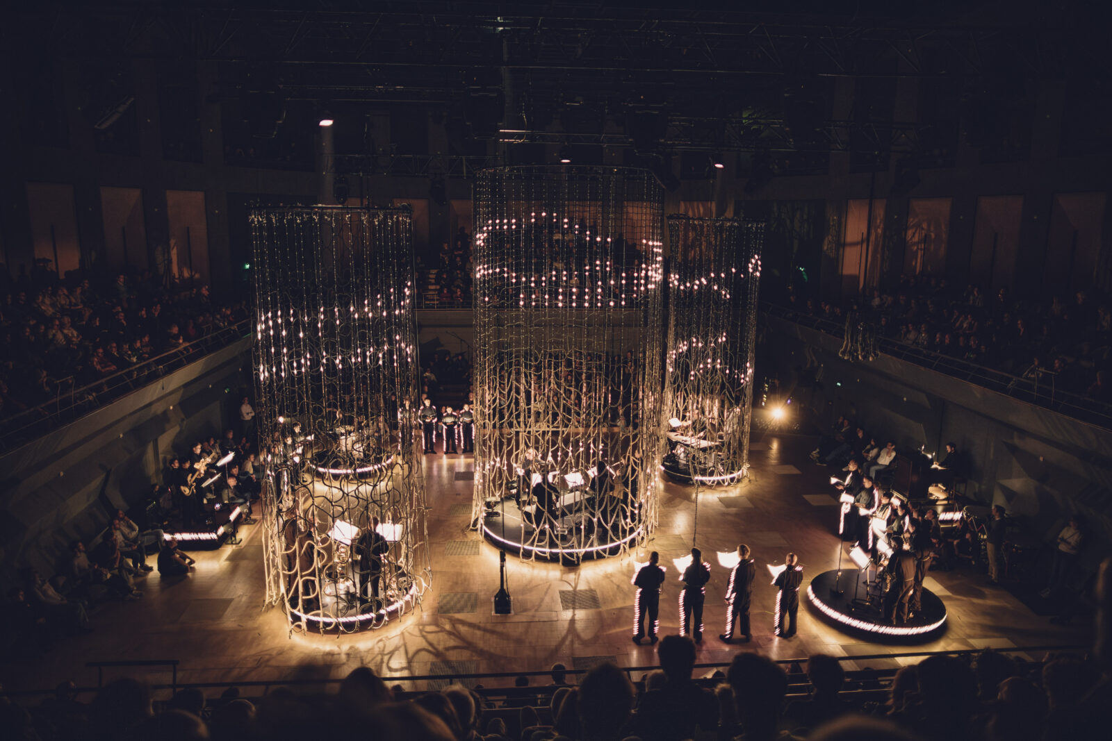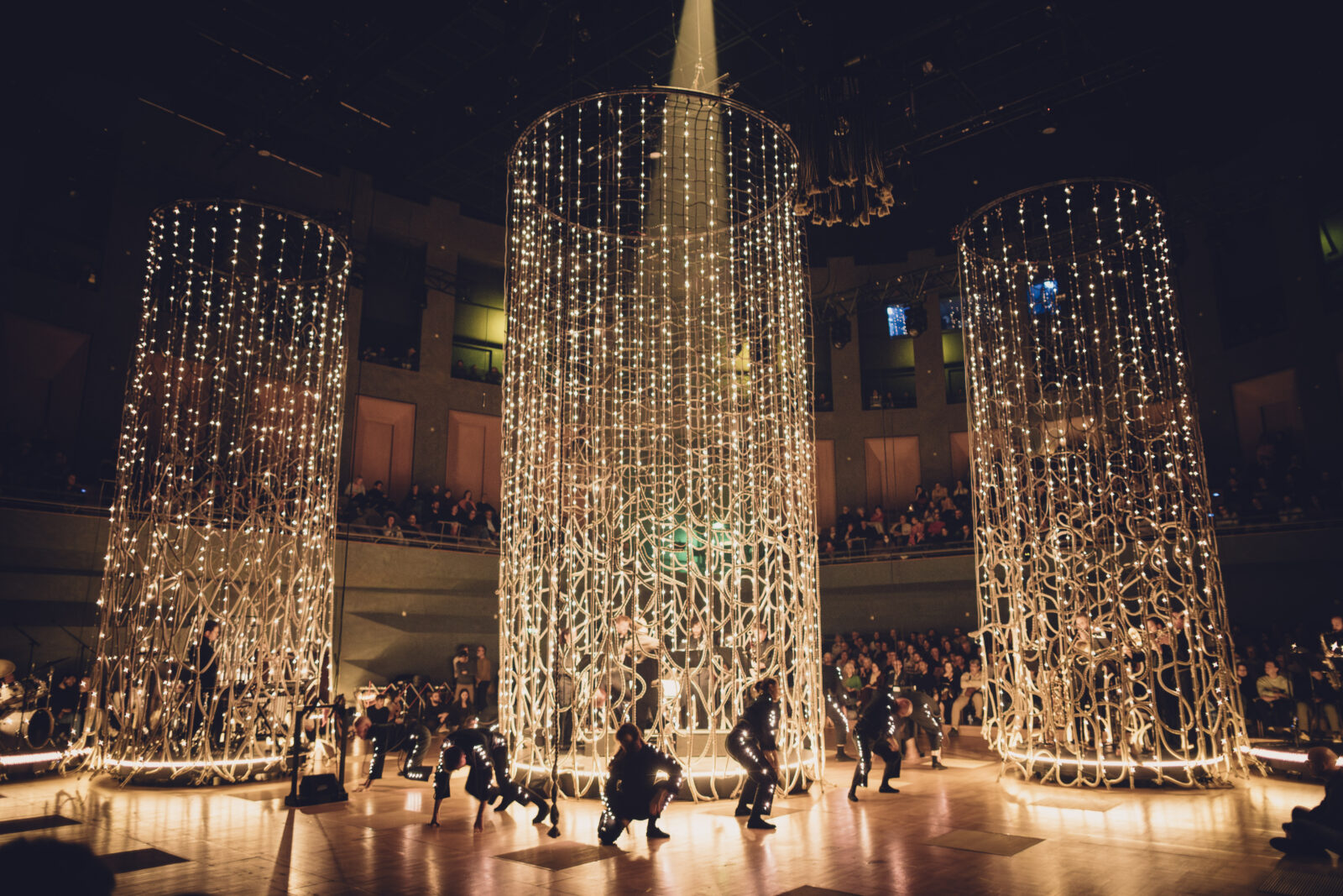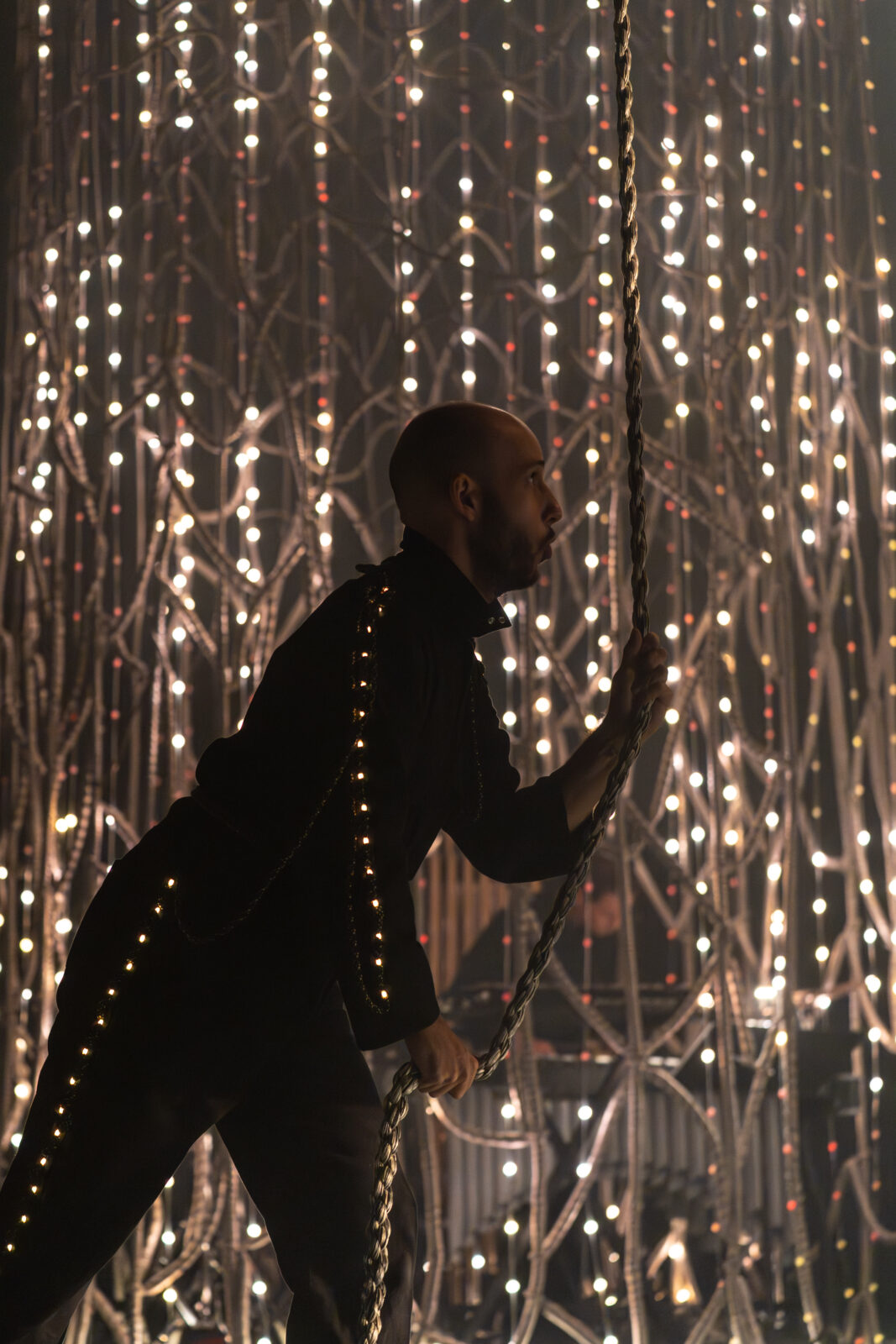 Voor Obsession ontwierp Chloé Bensahel een grootschalige textiele scenografie waarin herhaling, licht en beweging centraal staan. Het decor bestaat uit zes open grid-gordijnen van passement, met een kleurverloop van diepzwart naar metallic garens. Door de variërende dikte van de structuur – van 1 cm bovenaan tot 3 cm onderaan – krijgen de gordijnen een subtiele verbreding en een sterke ruimtelijke werking. Tijdens de voorstelling lichten LED-bronnen het metallic garen op, waardoor het textiel actief reageert op muziek en beweging.