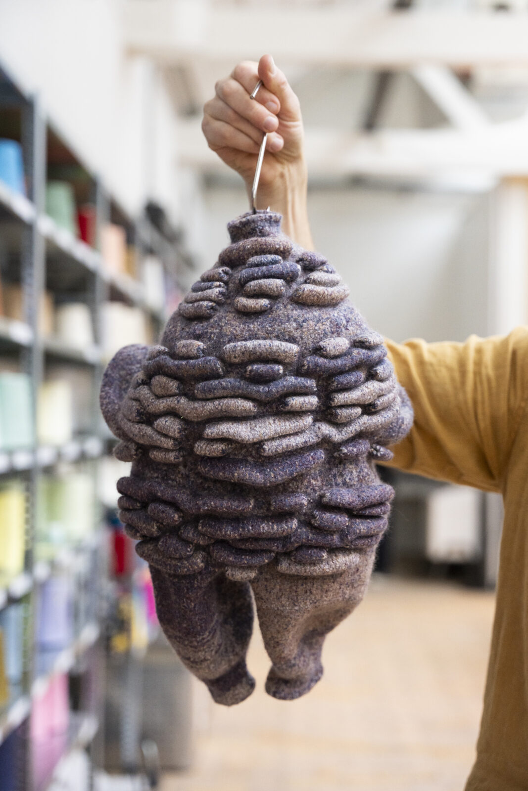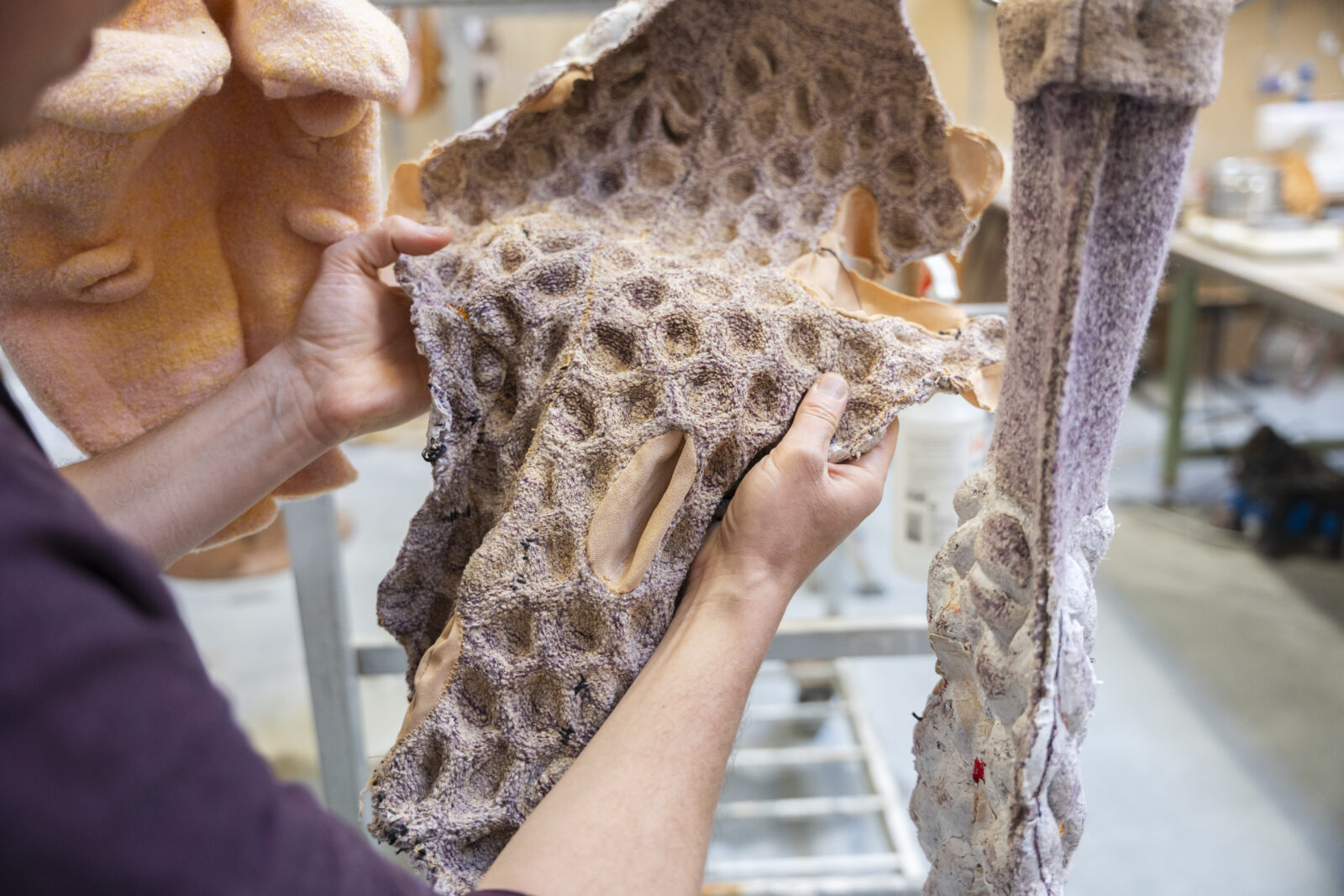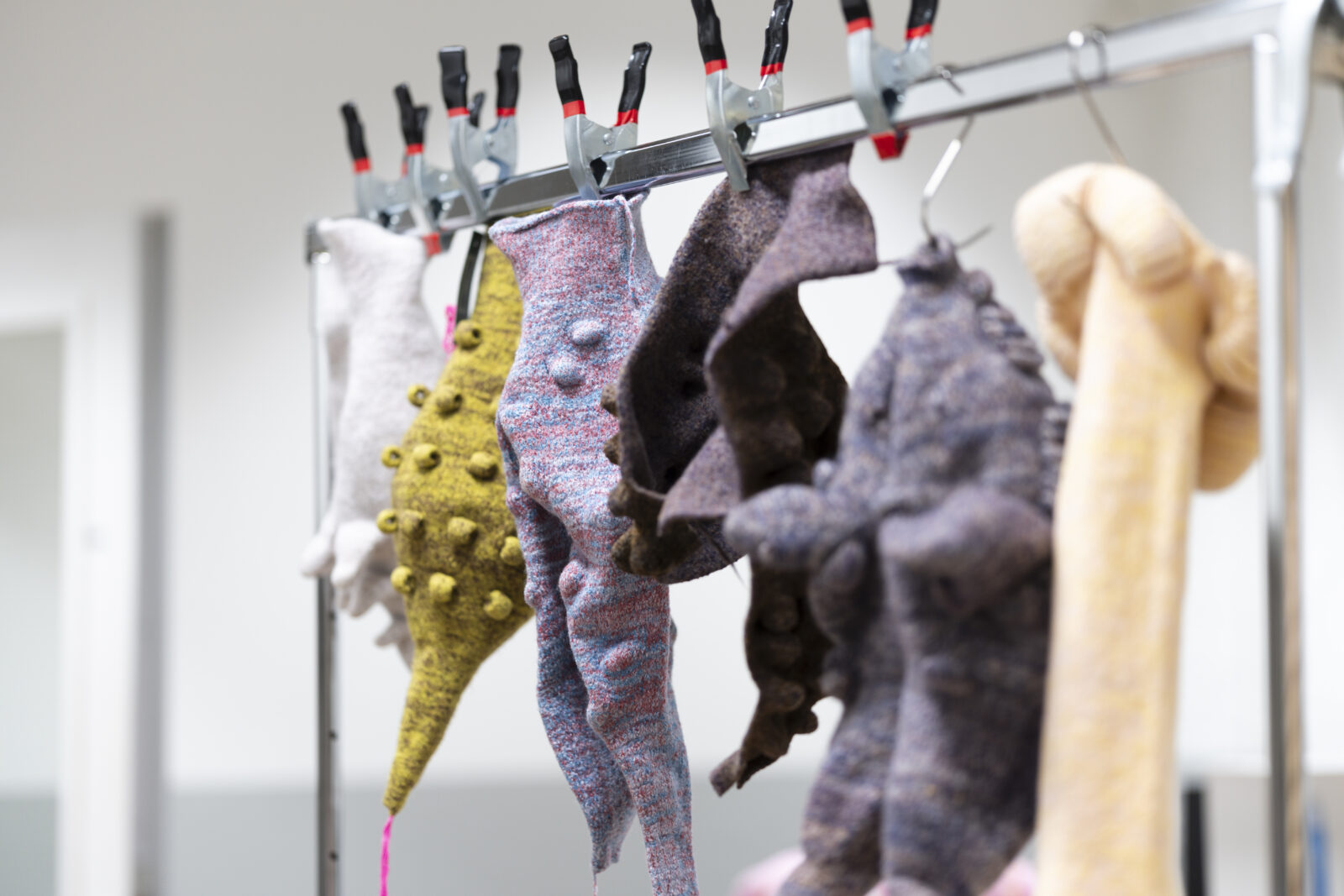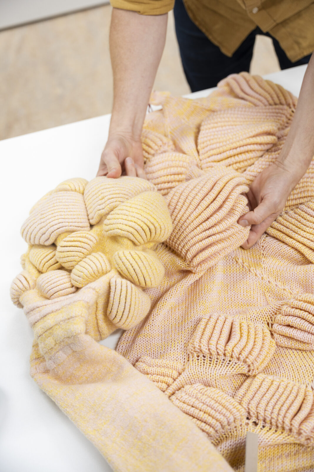 Chudyk vervaardigde de breisels op de computergestuurde vlakbreimachine en viltte ze vervolgens door te wassen. Zo ontstond een sterke, dichte textielstructuur die het vloeibare kleimateriaal kan dragen zonder te lekken. Tijdens het maakproces bepaalde hij de uiteindelijke afmetingen en vormen.