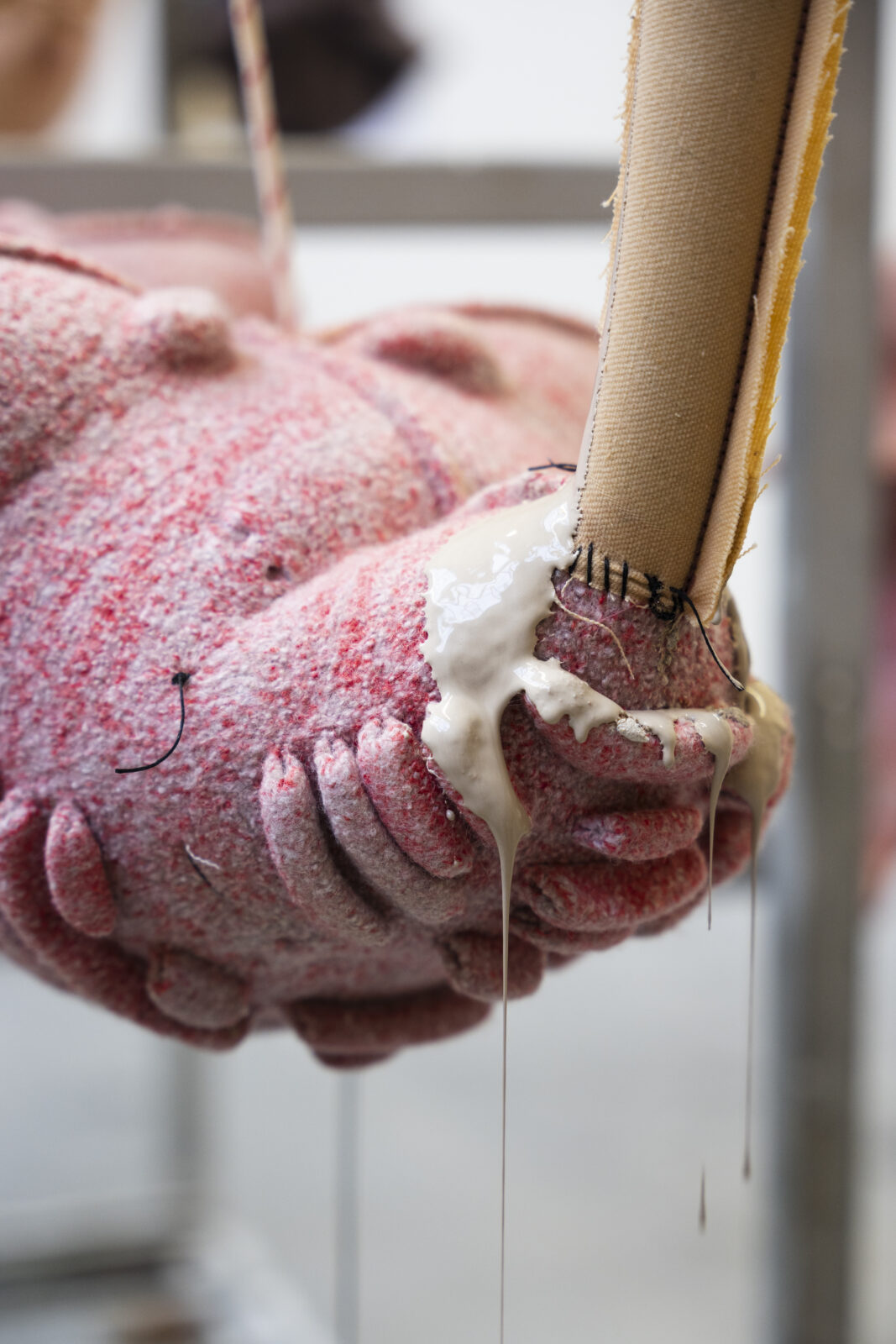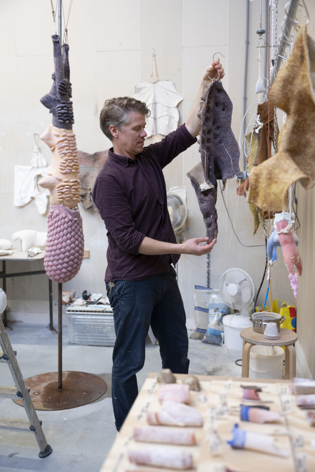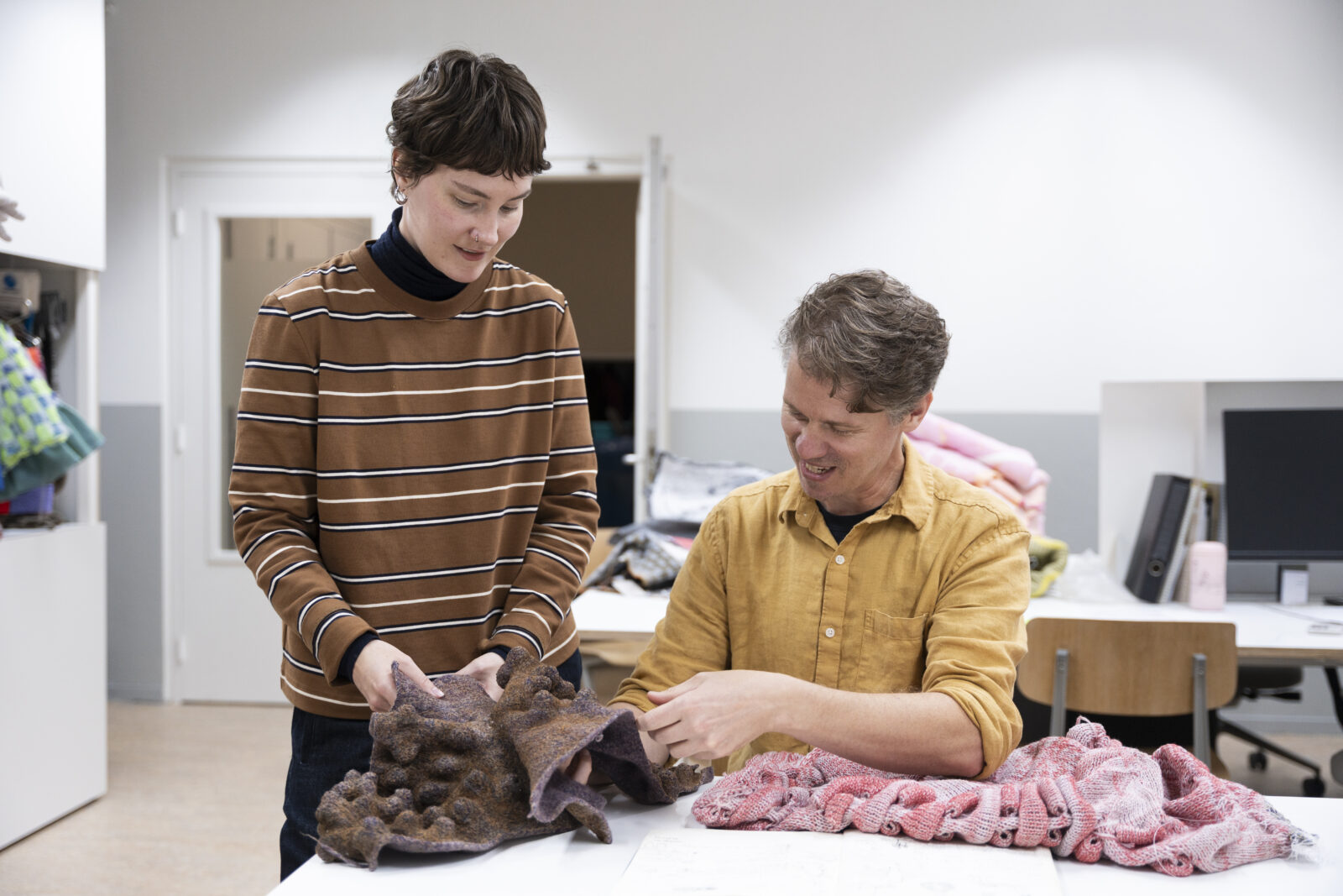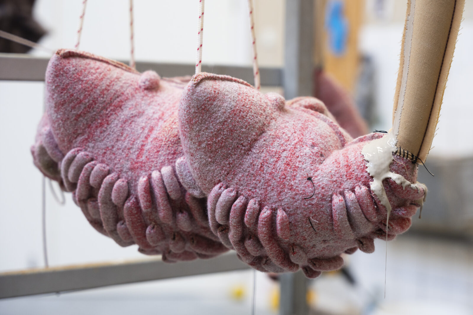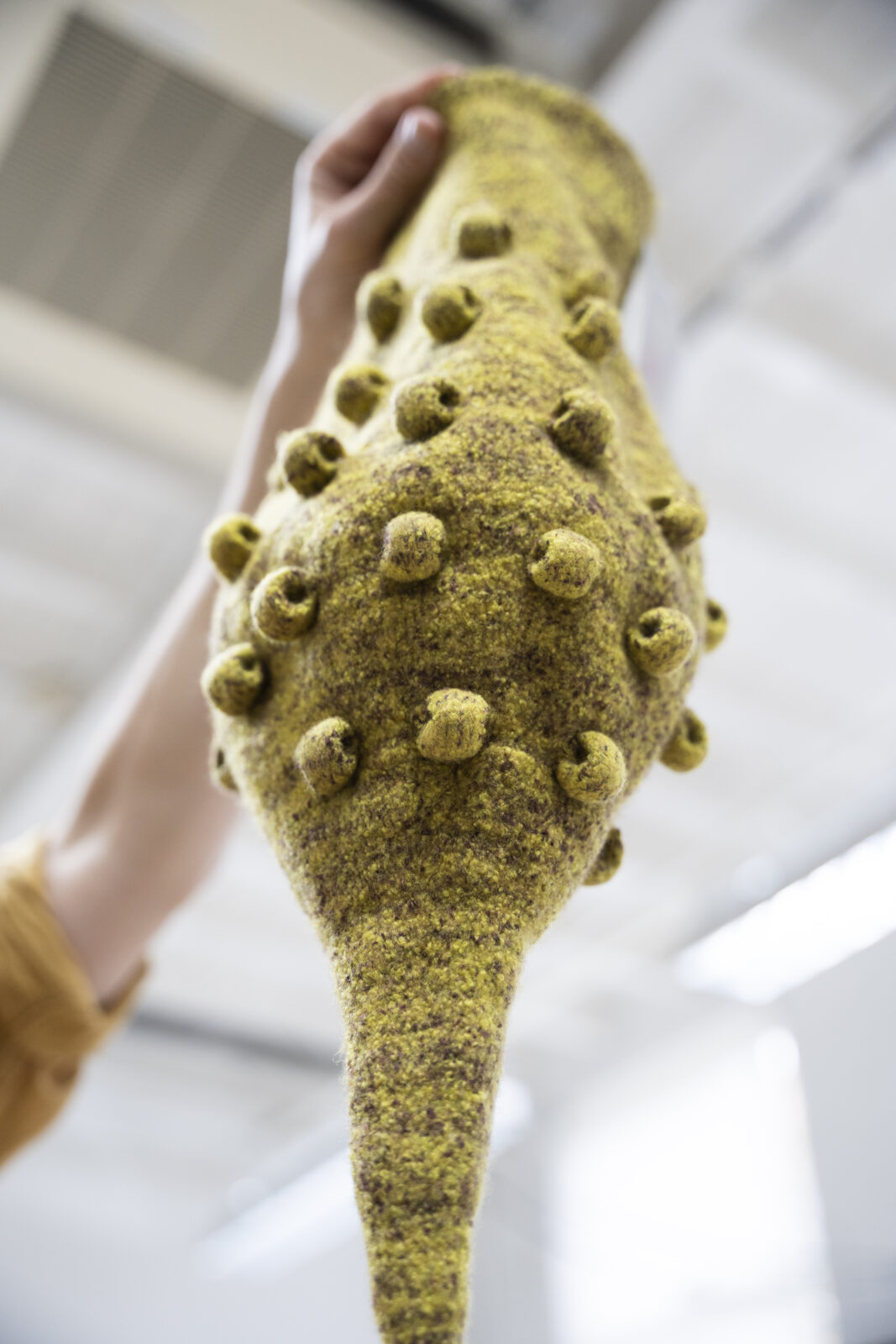 Chudyk vervaardigde de breisels op de computergestuurde vlakbreimachine en viltte ze vervolgens door te wassen. Zo ontstond een sterke, dichte textielstructuur die het vloeibare kleimateriaal kan dragen zonder te lekken. Tijdens het maakproces bepaalde hij de uiteindelijke afmetingen en vormen.