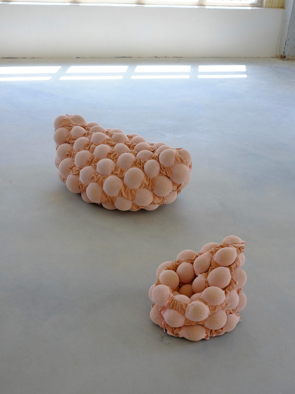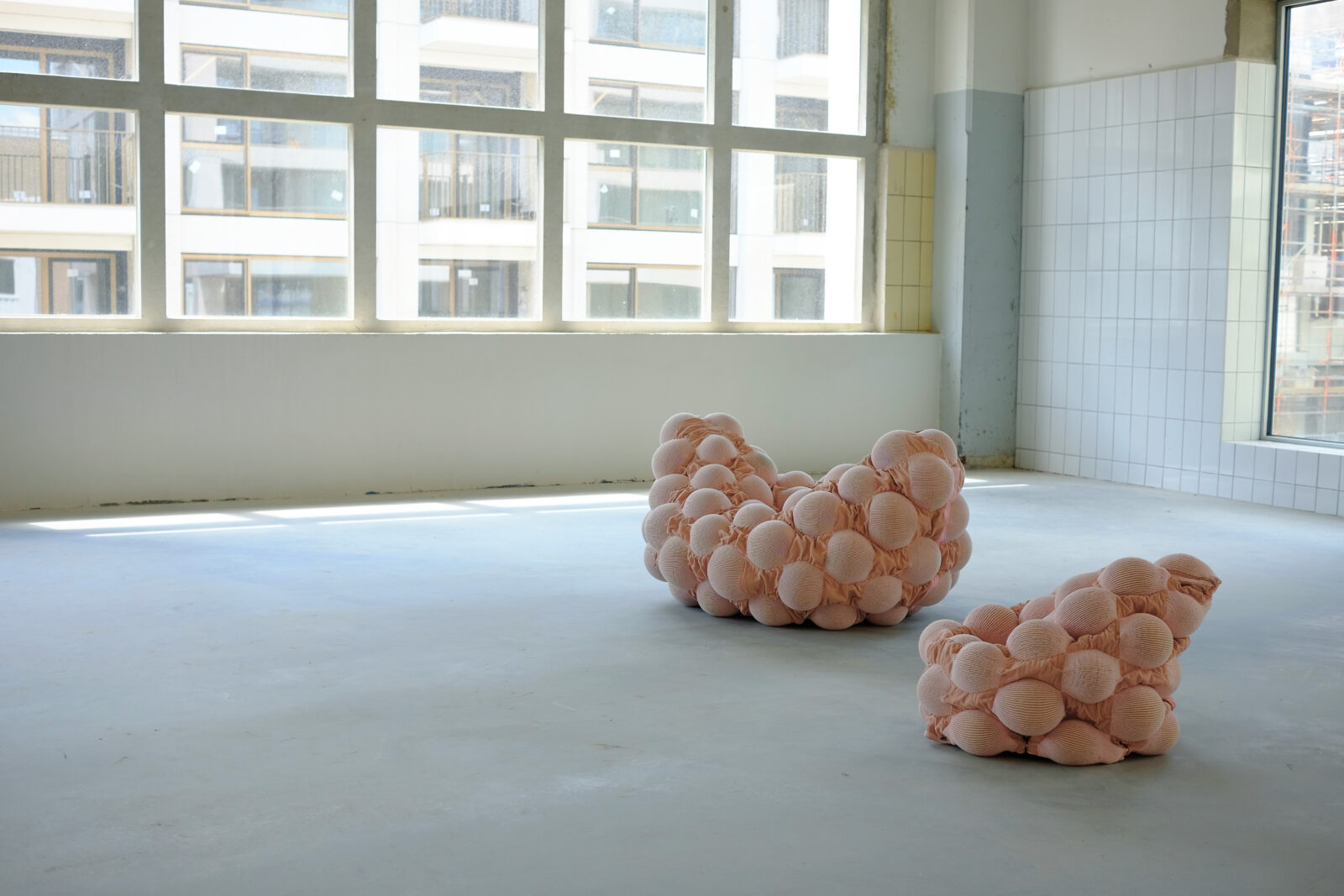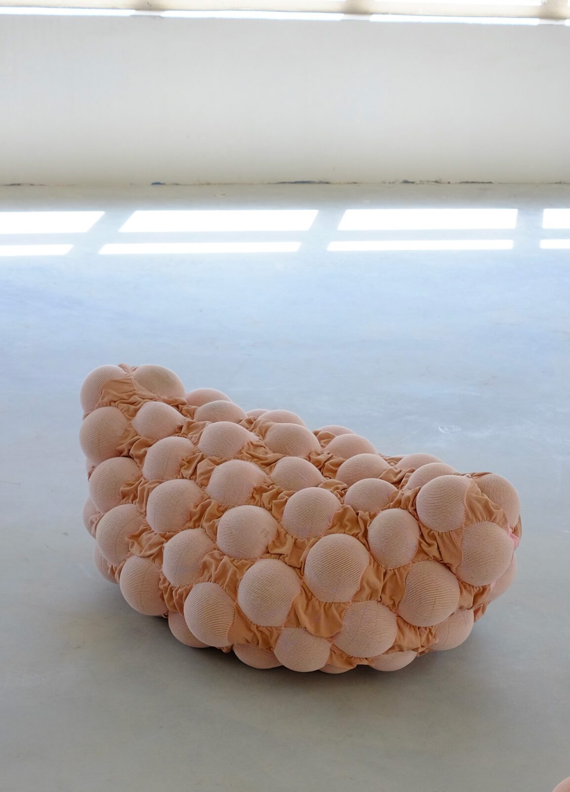 Door extra steken ontstaan bolvormige, bubble-achtige volumes die ergonomische steun bieden. In plaats van traditionele opblaasstoelen met hitte-gelaste naden bepaalt hier het breipatroon zelf hoe lucht stroomt en volumes ontstaan: het textiel vormt het systeem.