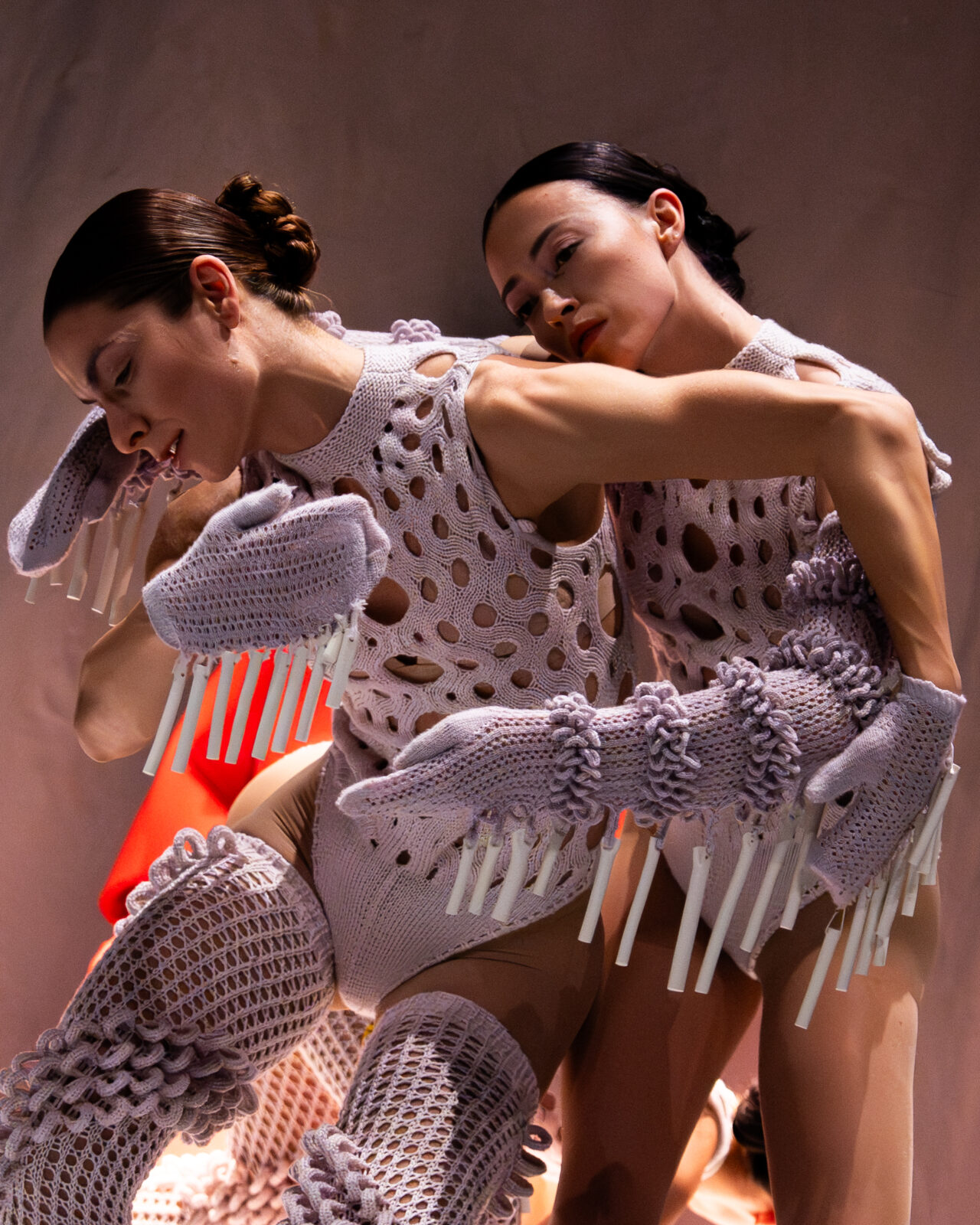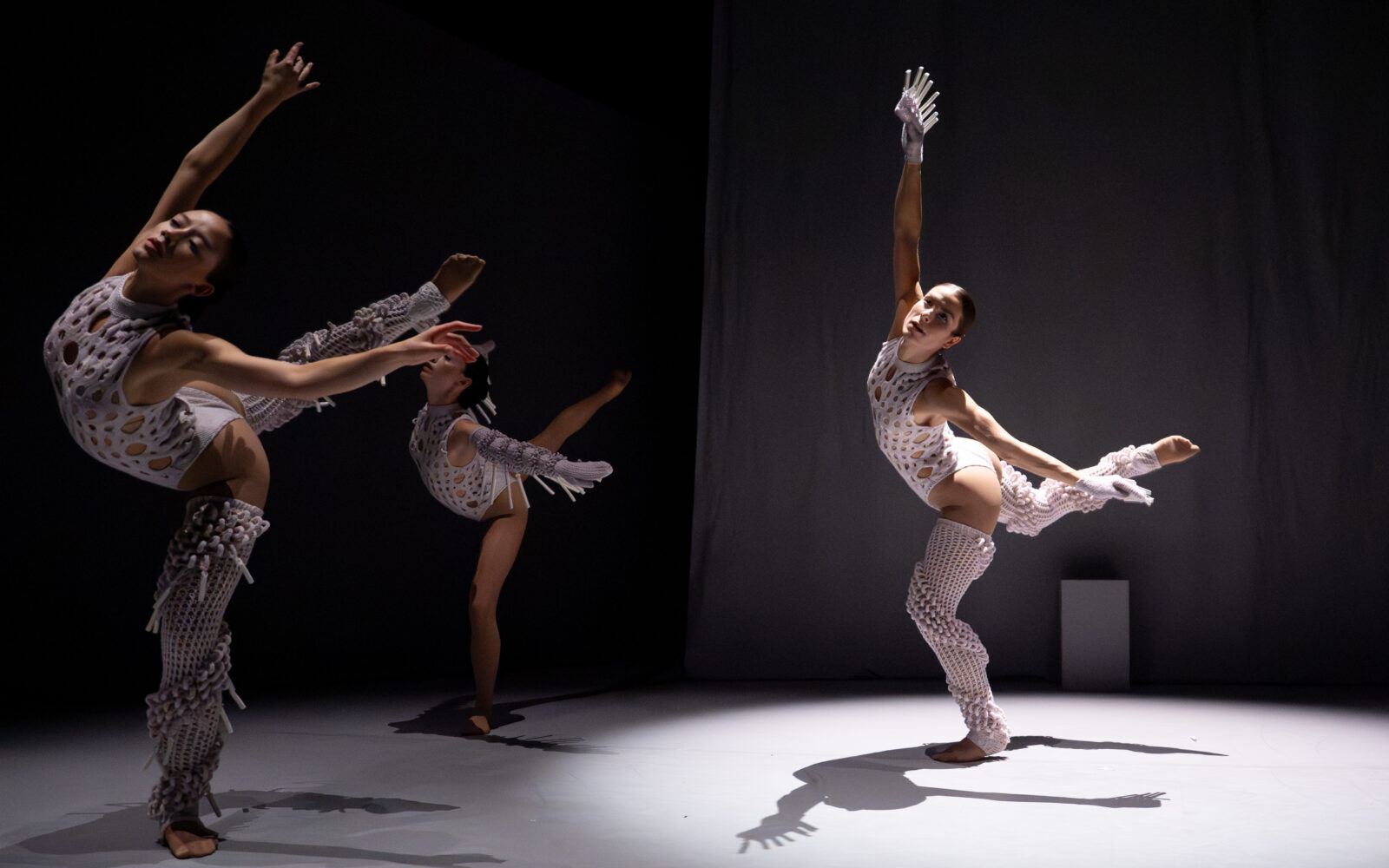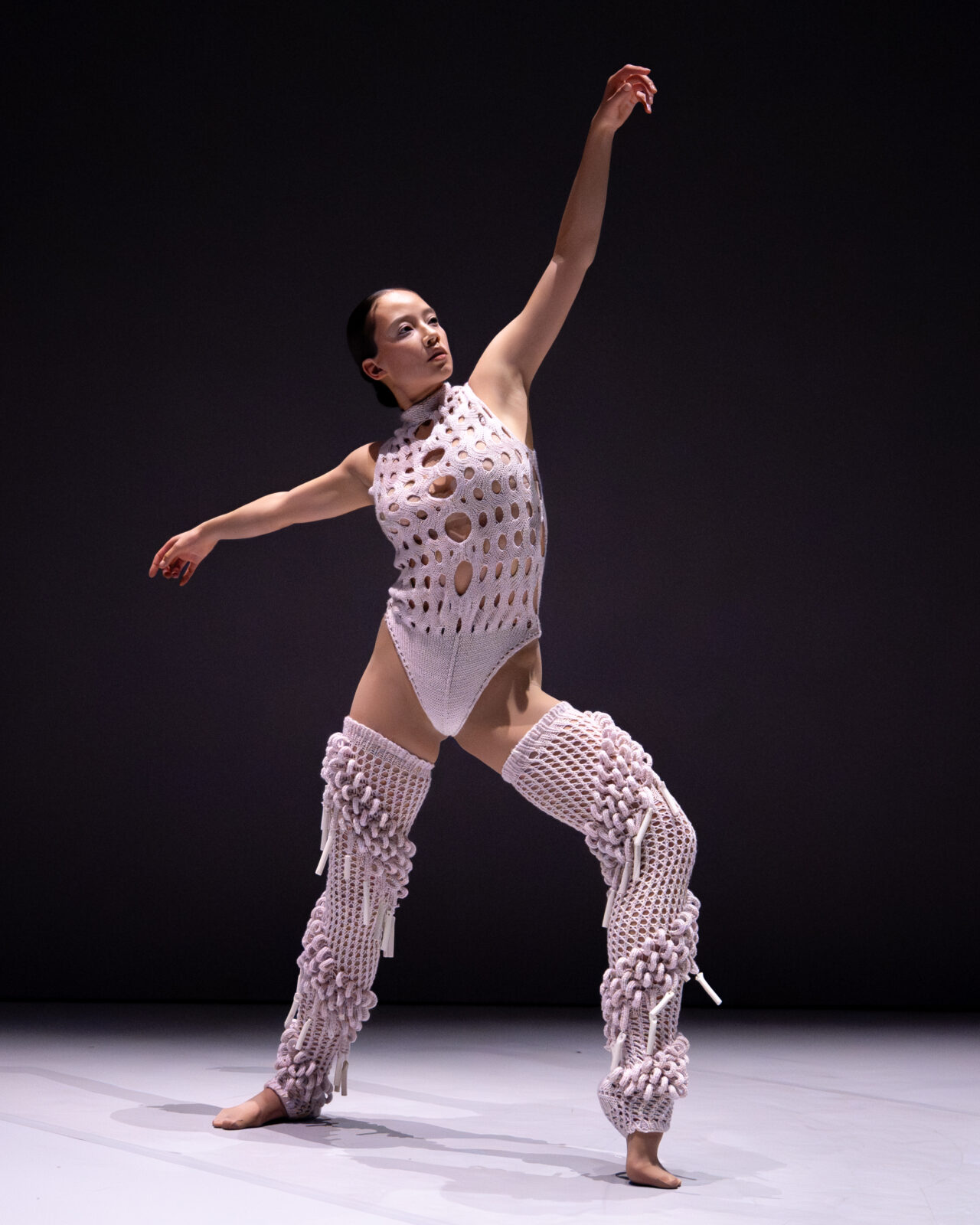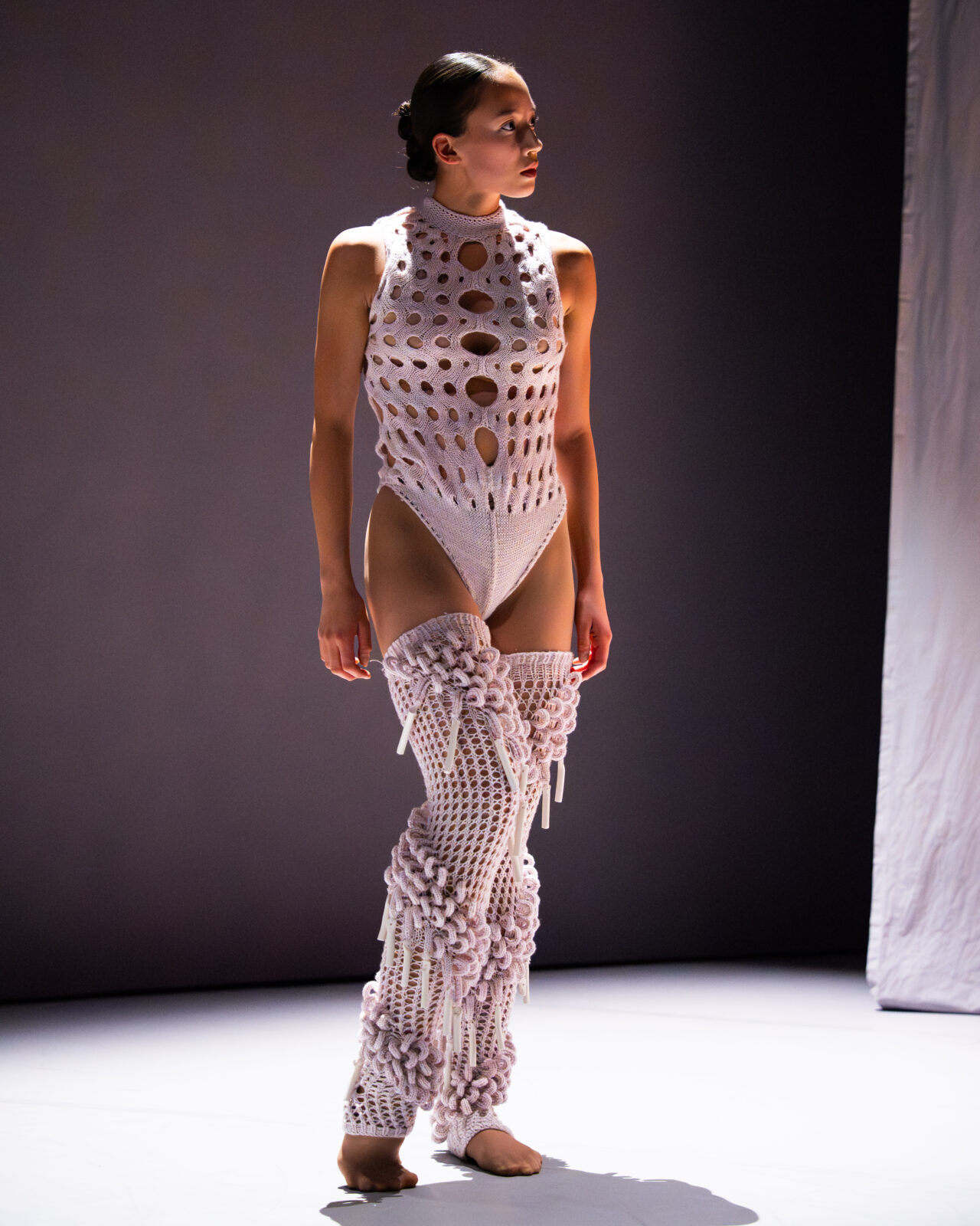 In ‘Figure’ onderzoekt Lisa Konno de interactie tussen mode, beweging en geluid. In het TextielLab breide Konno kostuums met diverse structuren en technieken. Ze experimenteerde met vormen, breipatronen en texturen, met als doel zowel draagbaarheid als geluidseffecten te optimaliseren. Ook Konno combineerde een residentie bij het Europees Keramisch Werkcentrum, het internationaal residentiecentrum in Oisterwijk, met een werkperiode in het TextielLab. In haar werk integreerde ze keramische elementen die bij beweging klank creëren, zodat de choreografie en muziek rechtstreeks vanuit de kleding ontstaan. De kostuums vertellen een persoonlijk verhaal over het vrouwelijk levenspad en laten zien hoe mode zowel bevrijdend als beperkend kan zijn.