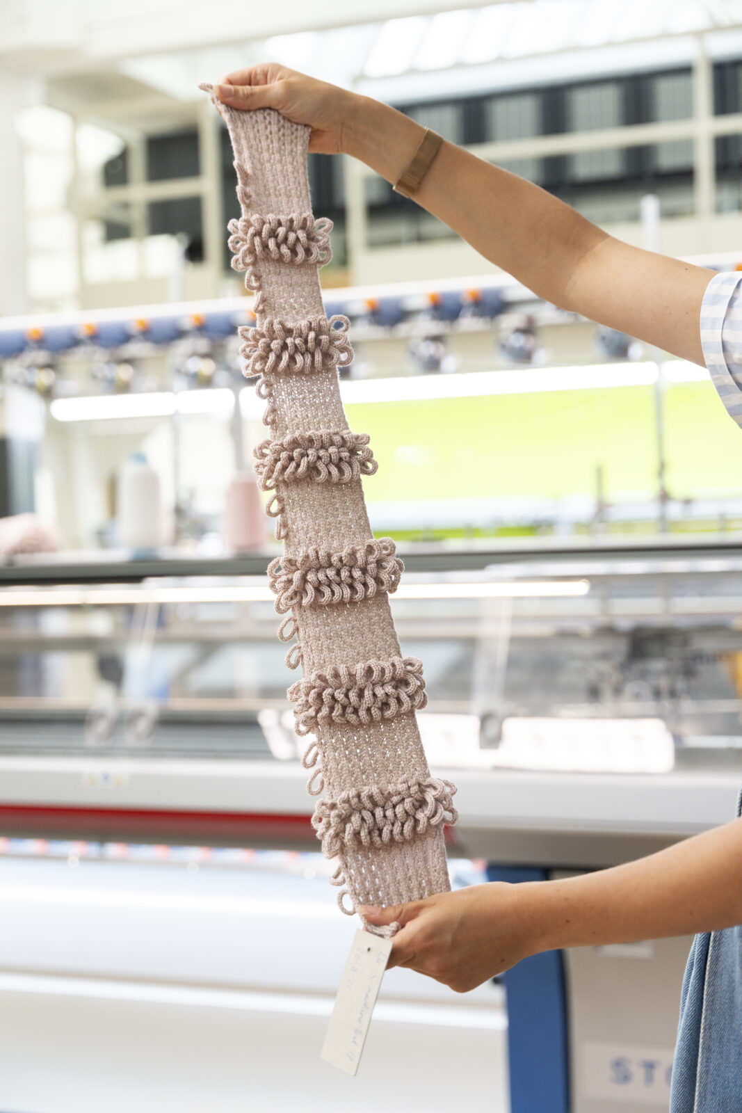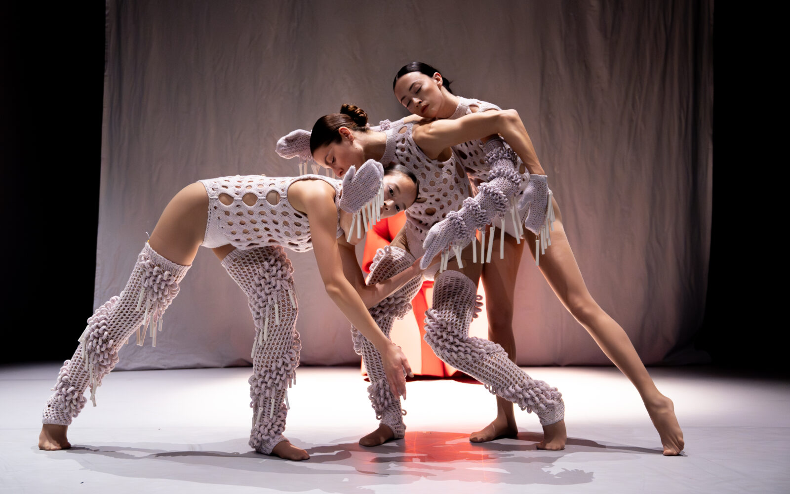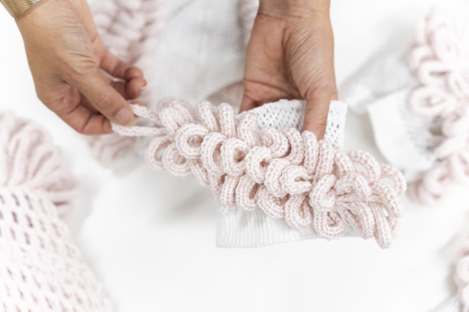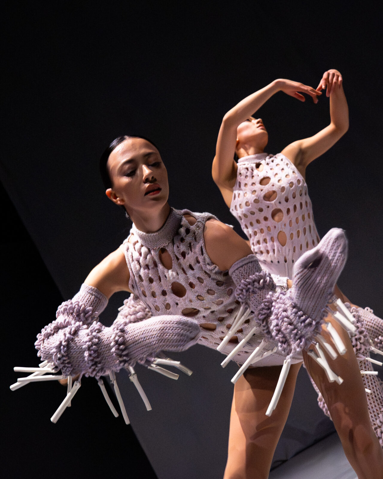 In ‘Figure’ onderzoekt Lisa Konno de interactie tussen mode, beweging en geluid. In het TextielLab breide Konno kostuums met diverse structuren en technieken. Ze experimenteerde met vormen, breipatronen en texturen, met als doel zowel draagbaarheid als geluidseffecten te optimaliseren. Ook Konno combineerde een residentie bij het Europees Keramisch Werkcentrum, het internationaal residentiecentrum in Oisterwijk, met een werkperiode in het TextielLab. In haar werk integreerde ze keramische elementen die bij beweging klank creëren, zodat de choreografie en muziek rechtstreeks vanuit de kleding ontstaan. De kostuums vertellen een persoonlijk verhaal over het vrouwelijk levenspad en laten zien hoe mode zowel bevrijdend als beperkend kan zijn.