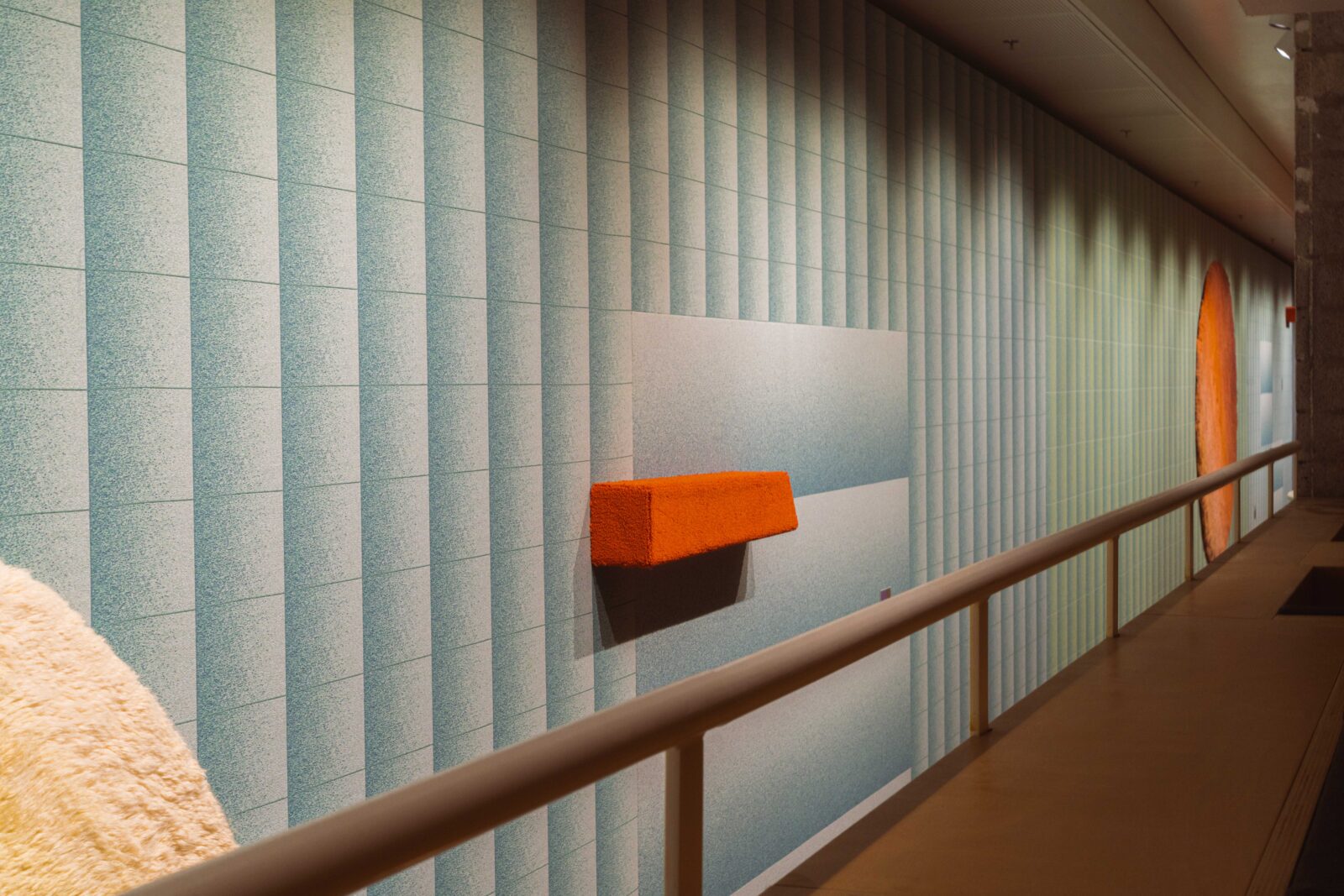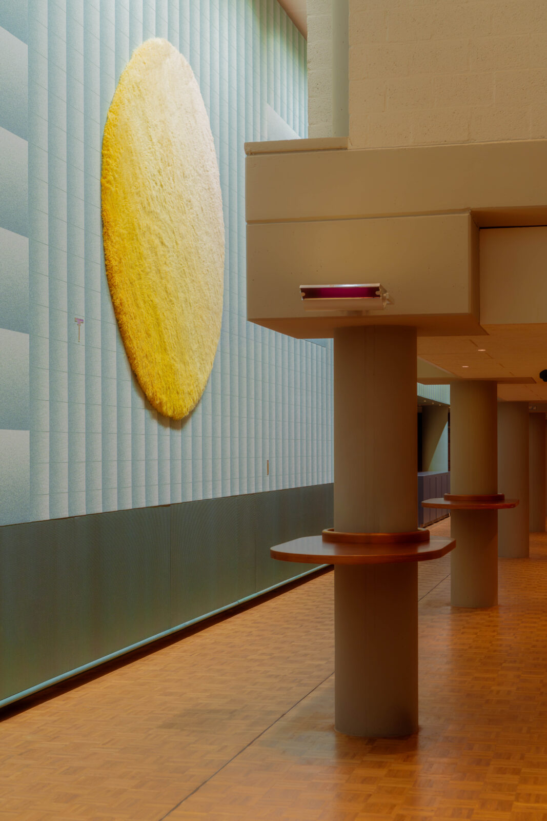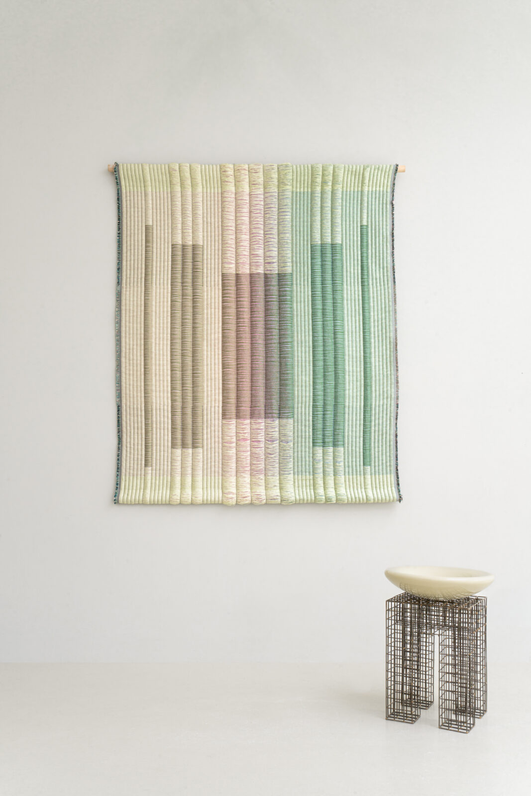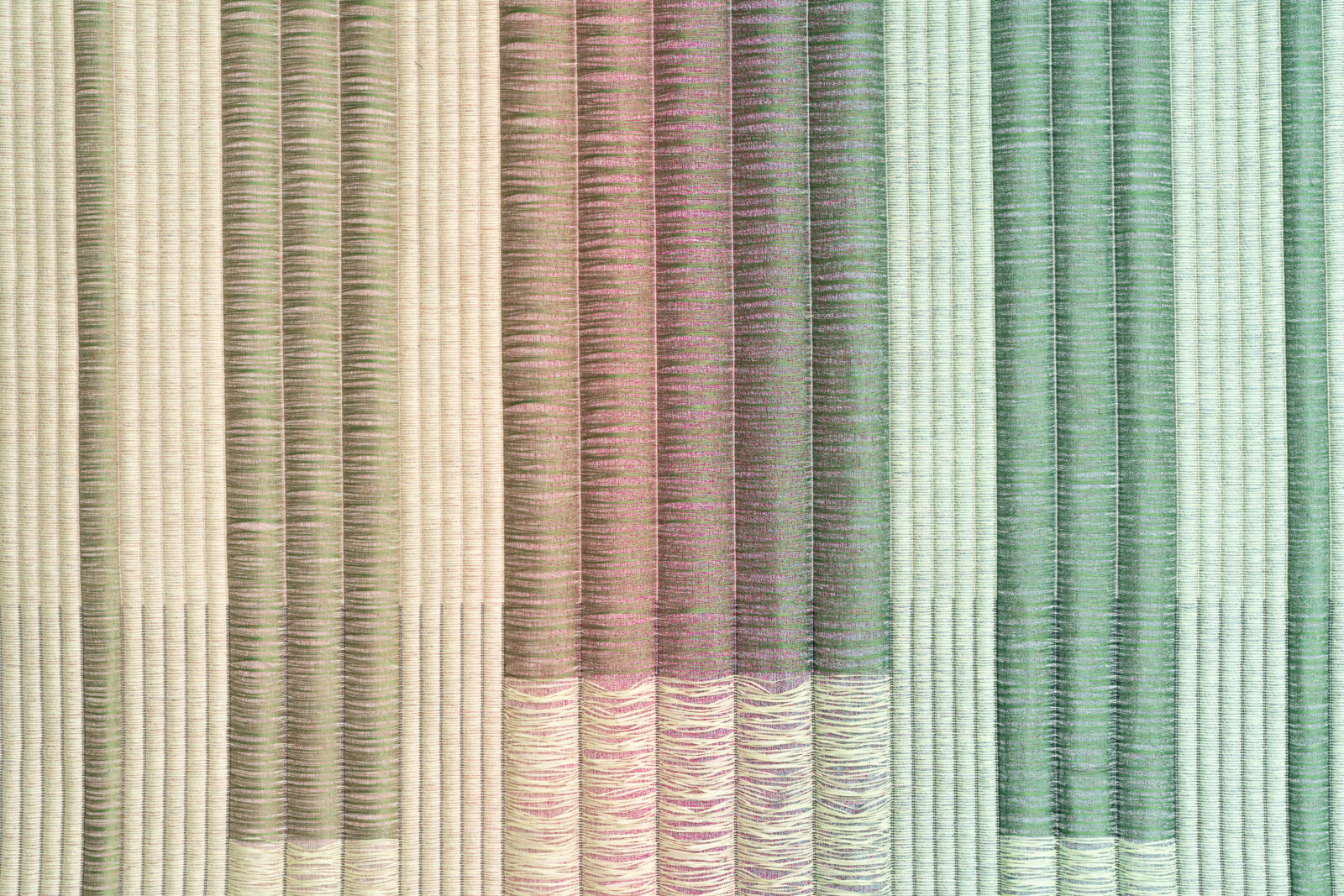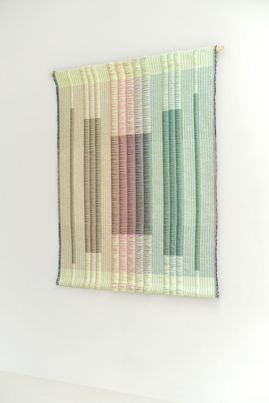 Het werk ‘VIVID Meadow’ is een Jacquard-geweven wandkleed van Mae Engelgeer. Engelgeer bouwde het werk op uit meerdere lagen, waarbij zwevende garens subtiele kleur verlopen onthullen onder een bovenlaag van papieren garens. De grafische weefstructuur is geïnspireerd op Japanse tatami-vloeren, waarin ribstructuren en ritme een sterke visuele en tactiele aanwezigheid hebben.