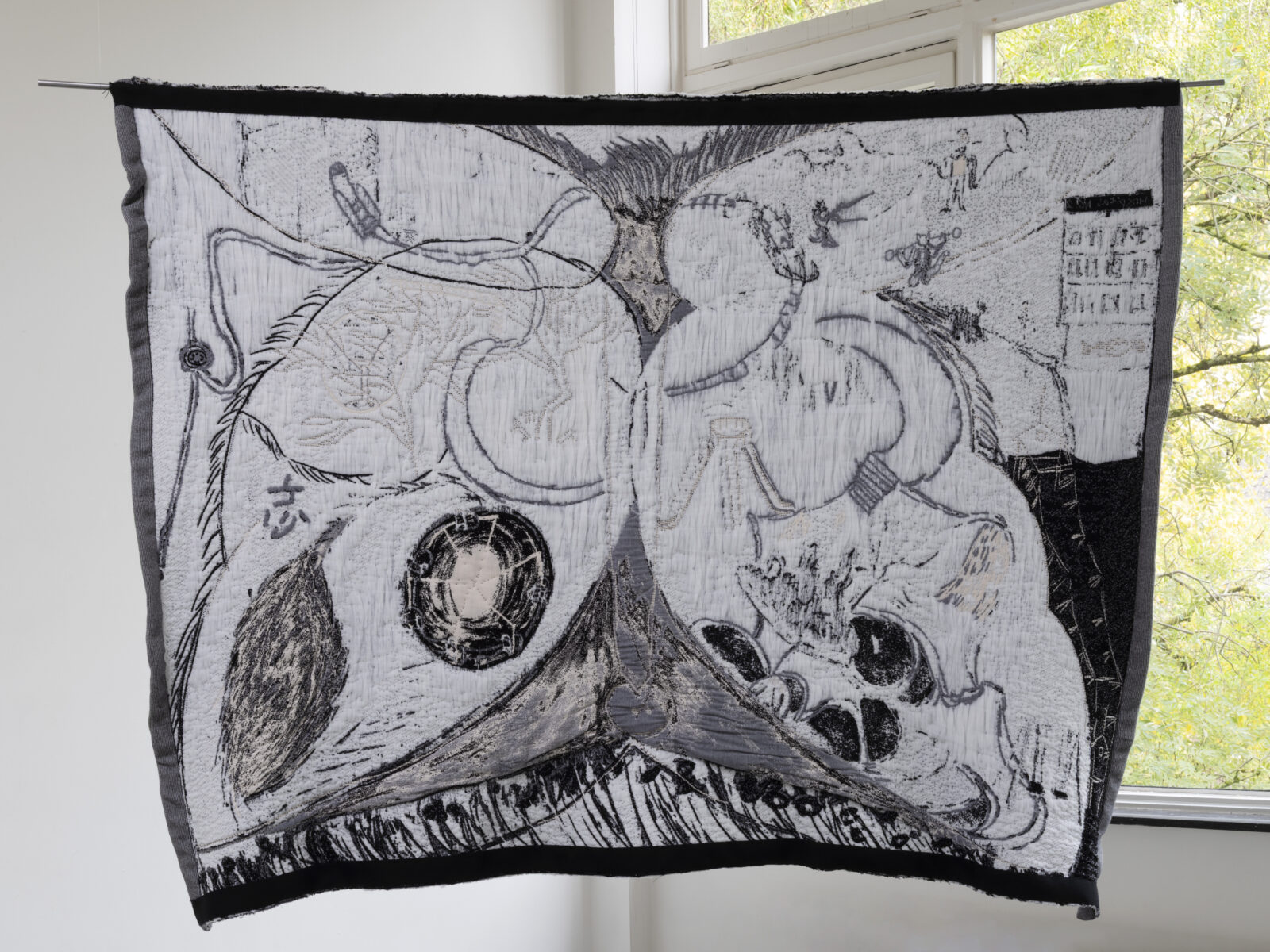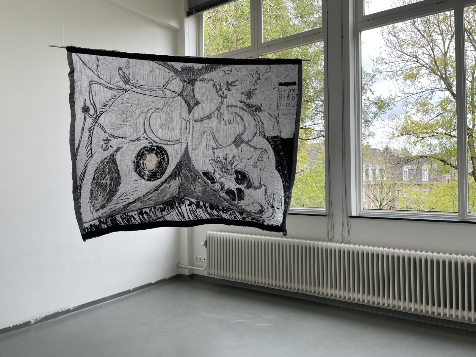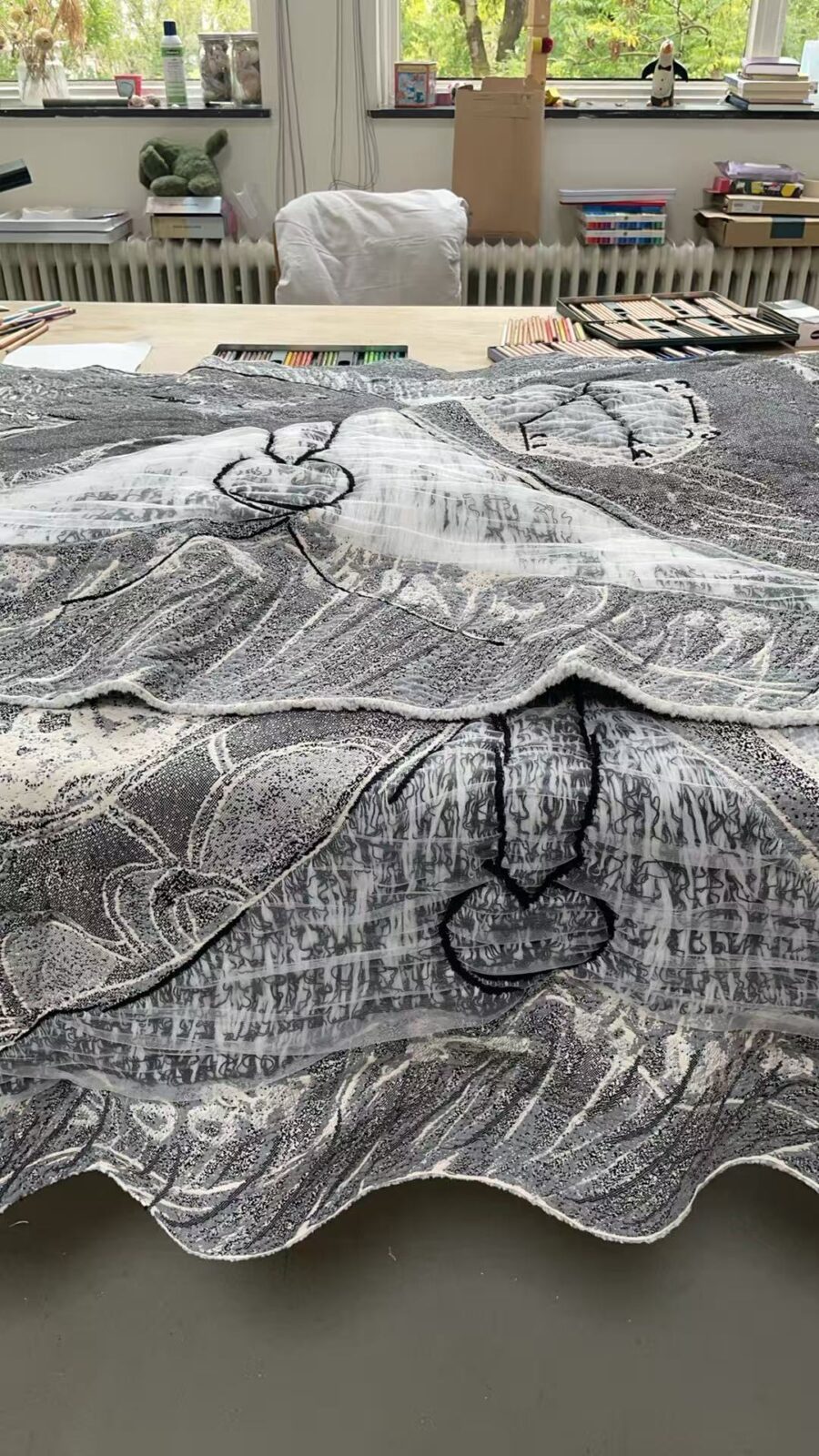 Meng Zhang is illustrator en kunstenaar, werkzaam tussen Duitsland en China, en als resident werkzaam aan de Jan van Eyck Academie in 2025. In het TextielLab vertaalde Zhang voor het eerst haar tekenpraktijk naar textiel en ontwikkelde zij drie wandkleden, één gebreid en twee geweven. Hierin komen jeugdherinneringen, speelsheid en een onderhuidse melancholie samen. De kracht van het werk ligt in een ogenschijnlijk lichte, bijna naïeve beeldtaal die zwaardere thema’s zoals sterfelijkheid, schaamte en kwetsbaarheid subtiel te benaderen.