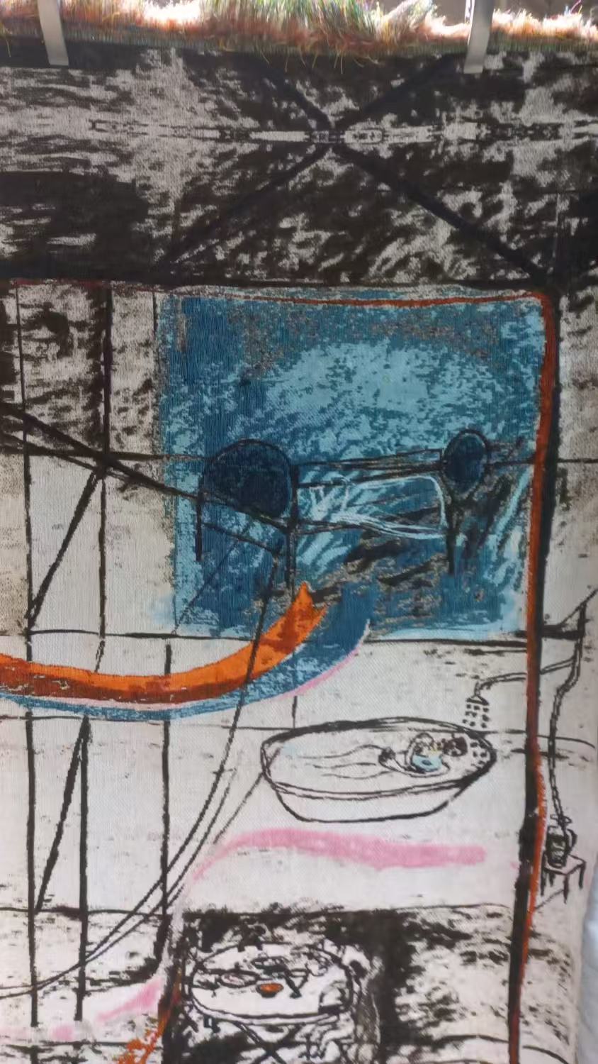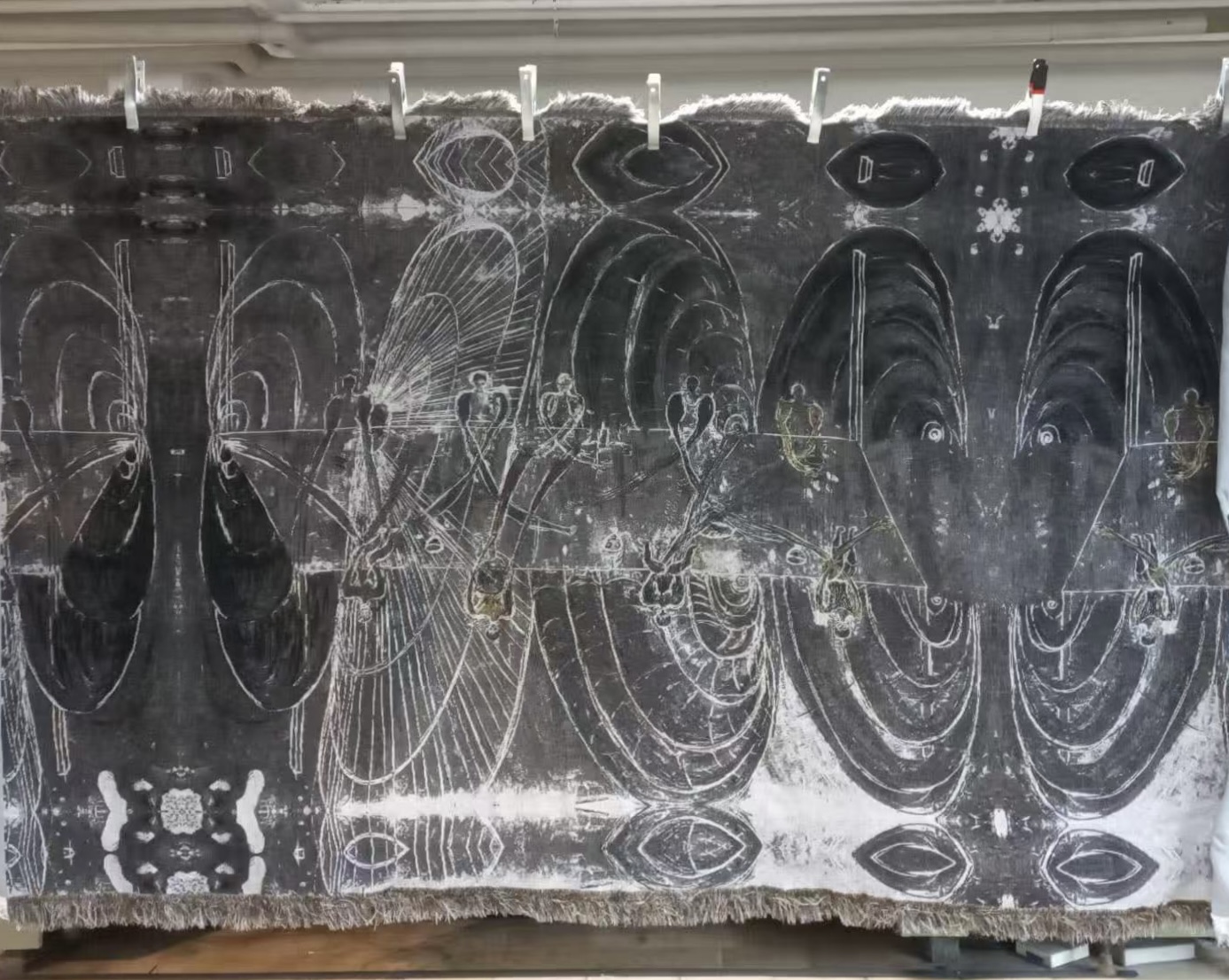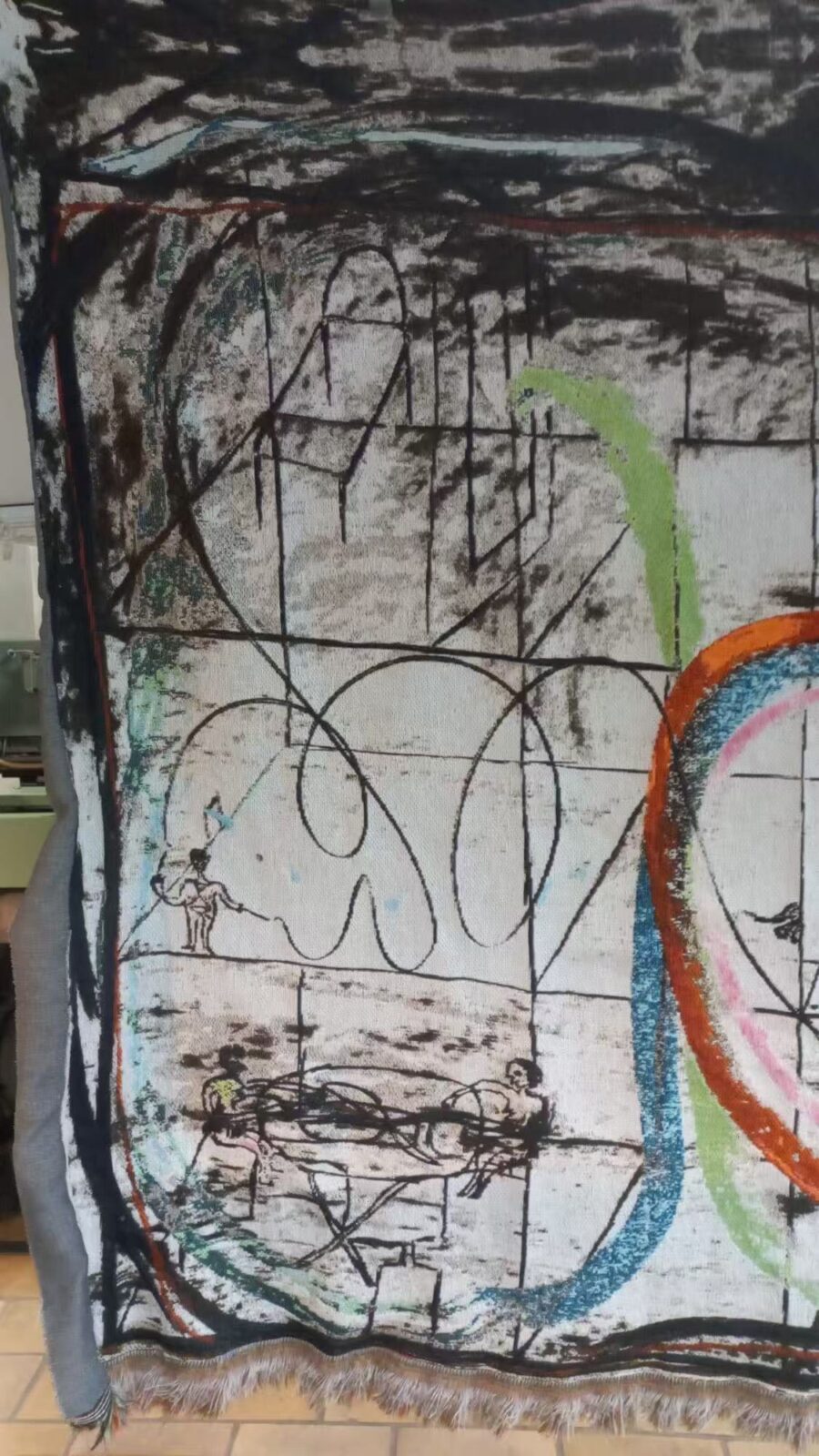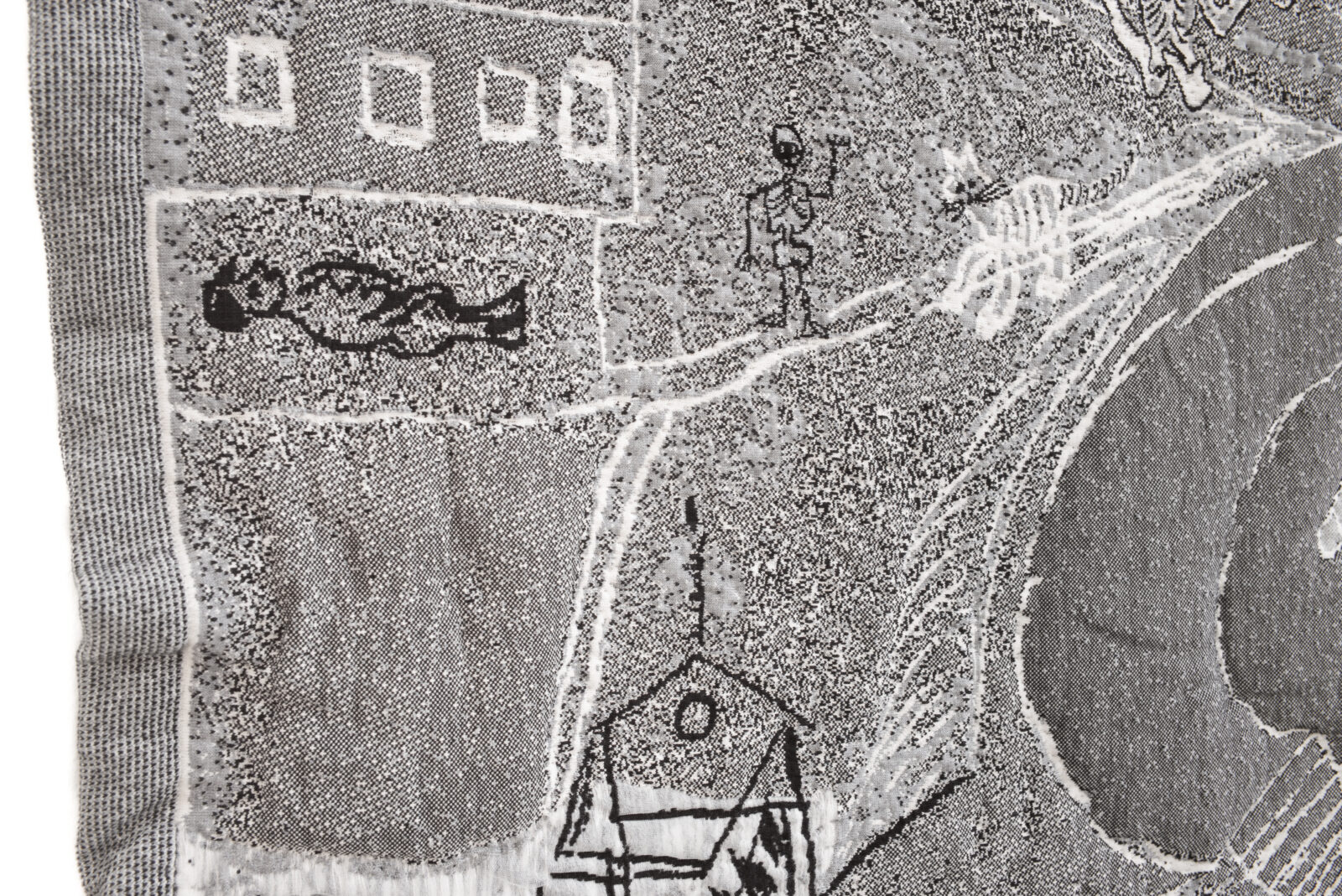 Meng Zhang is illustrator en kunstenaar, werkzaam tussen Duitsland en China, en als resident werkzaam aan de Jan van Eyck Academie in 2025. In het TextielLab vertaalde Zhang voor het eerst haar tekenpraktijk naar textiel en ontwikkelde zij drie wandkleden, één gebreid en twee geweven. Hierin komen jeugdherinneringen, speelsheid en een onderhuidse melancholie samen. De kracht van het werk ligt in een ogenschijnlijk lichte, bijna naïeve beeldtaal die zwaardere thema’s zoals sterfelijkheid, schaamte en kwetsbaarheid subtiel te benaderen.