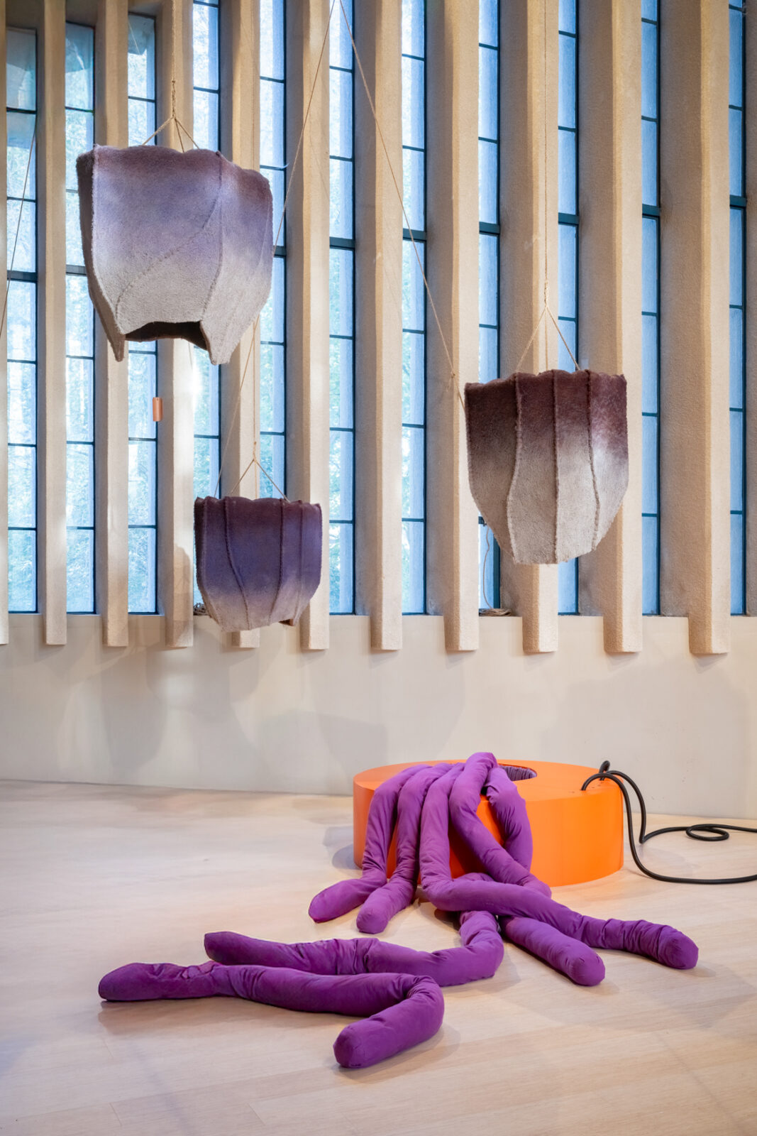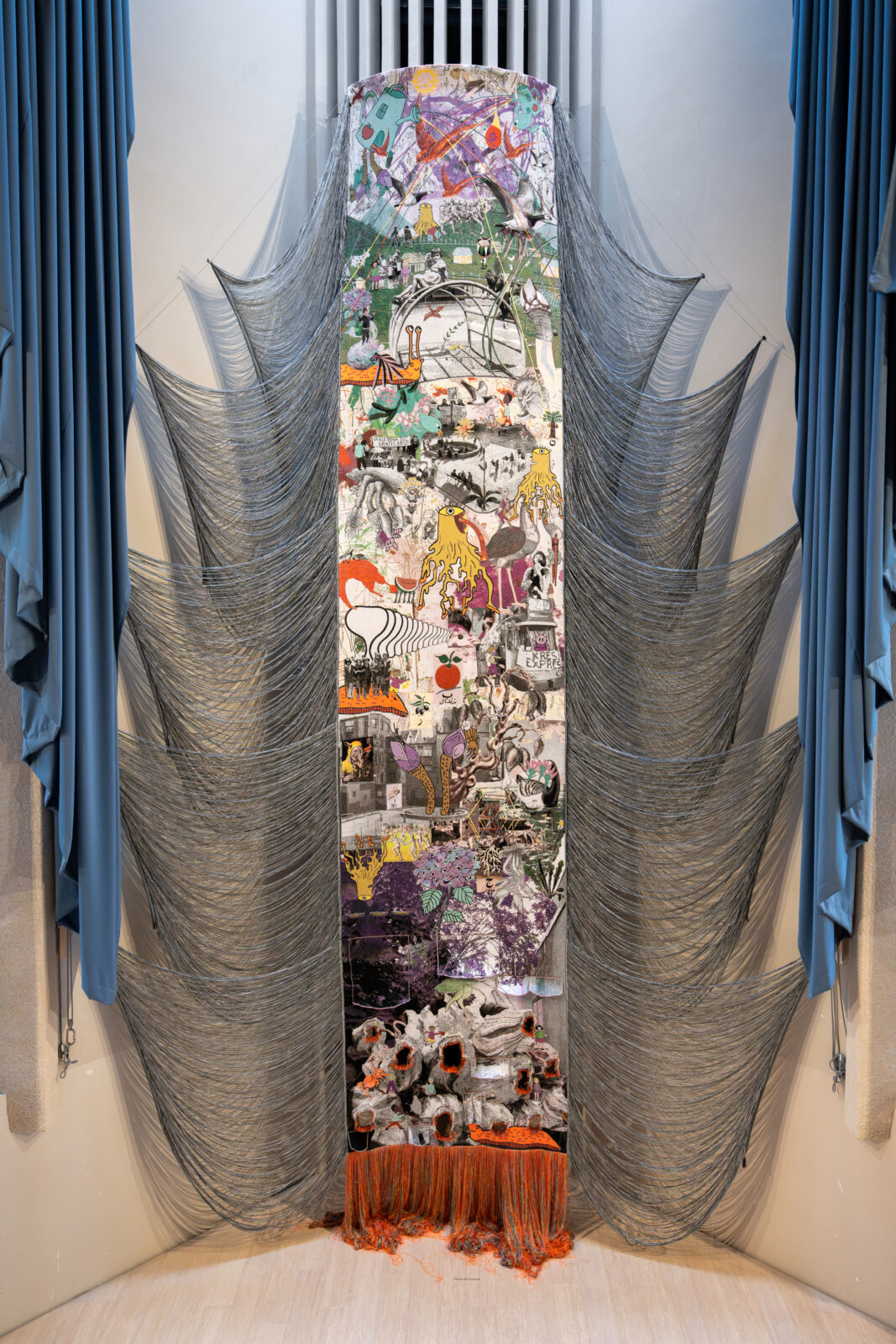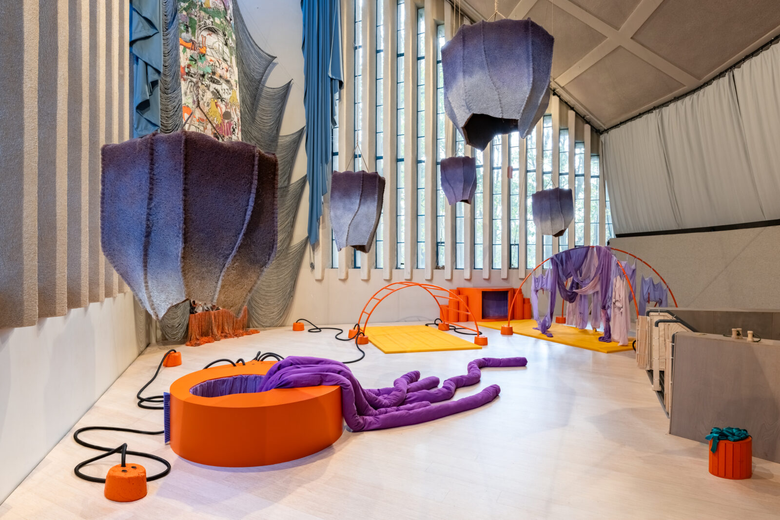 Mercedes Azpilicueta ontwikkelt sinds 2019 regelmatig wandkleden in het TextielLab. Voor ‘CaccHho CucchhA’, voor ‘de Appel’ in Amsterdam, ontwierp ze een groot interactief wandkleed met losse draden, gaten, zakjes en handvaten, waarmee kinderen spelend de compositie manipuleren. Mercedes assembleerde zelf vijf losse wandkleden tot één groot werk. Het werk is speels van karakter, met extra aandacht voor veiligheid en stevigheid bij de delen die opengeknipt worden.
