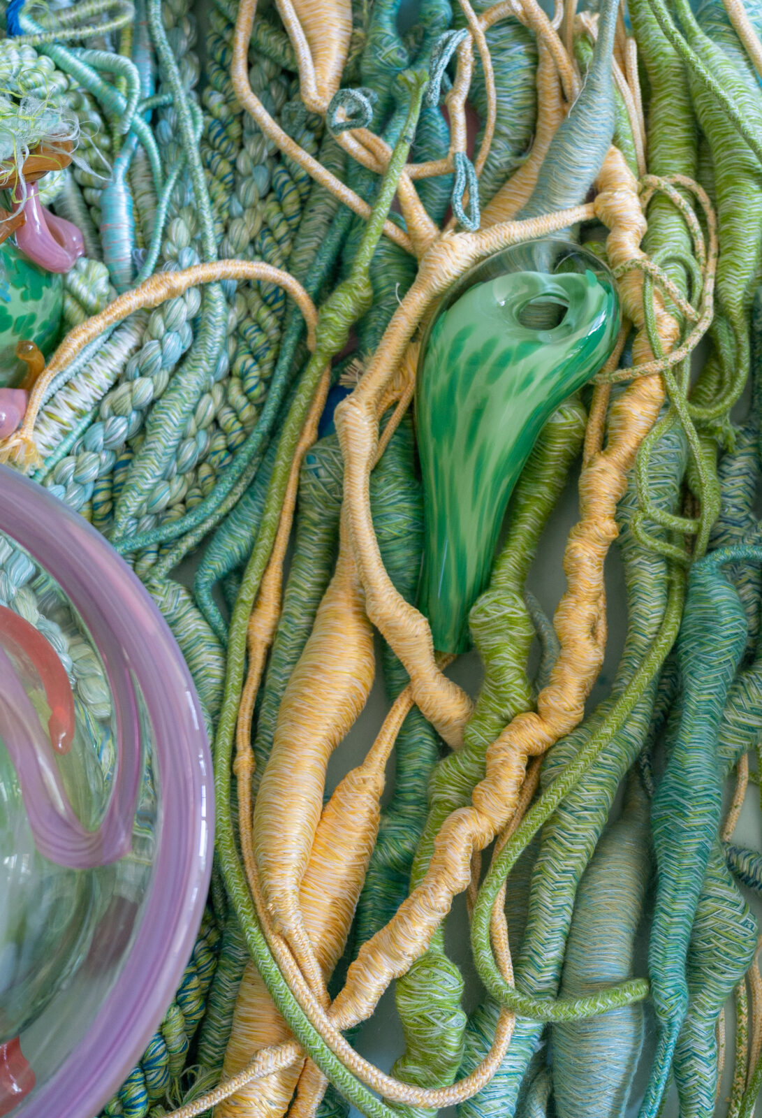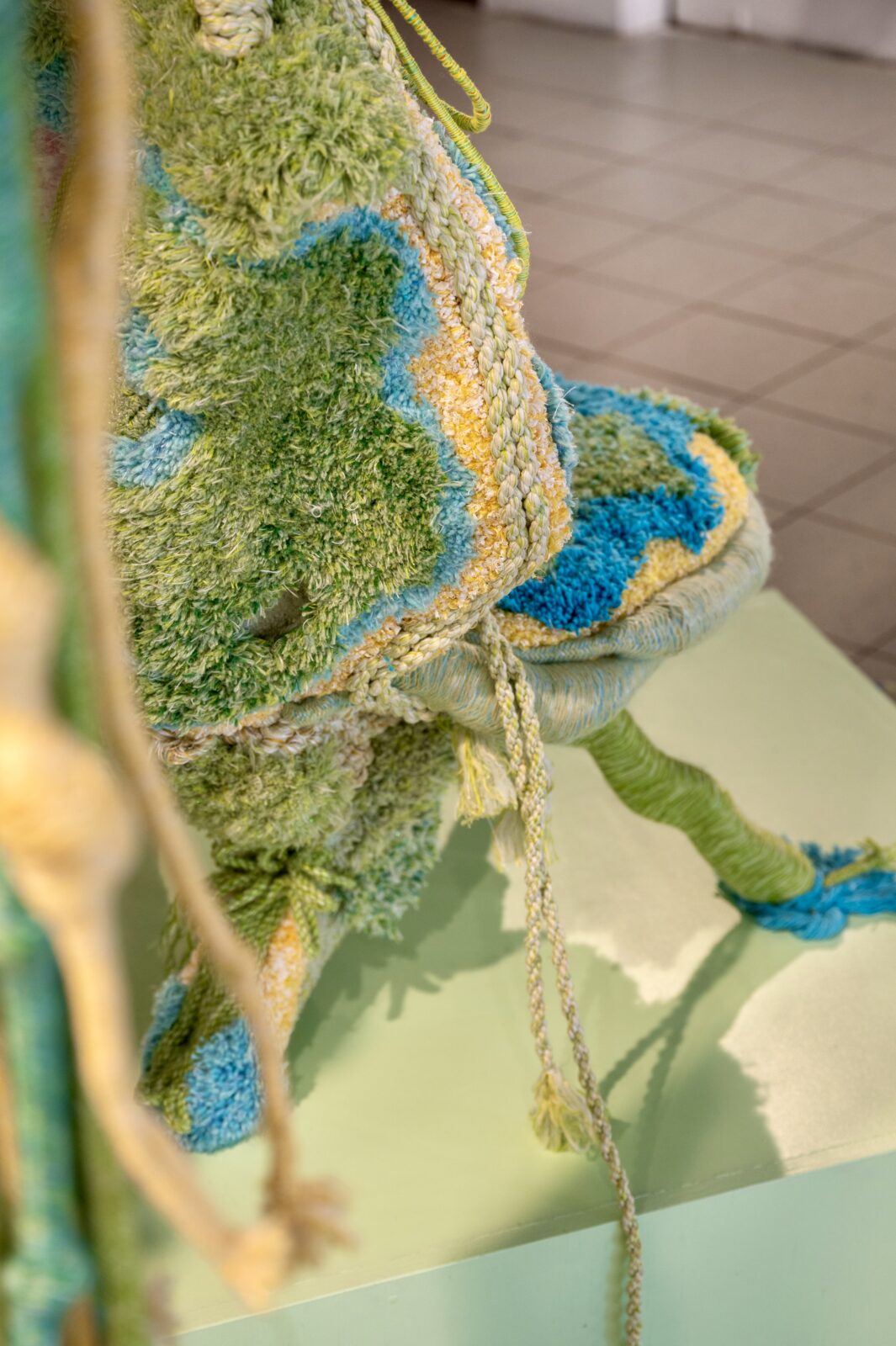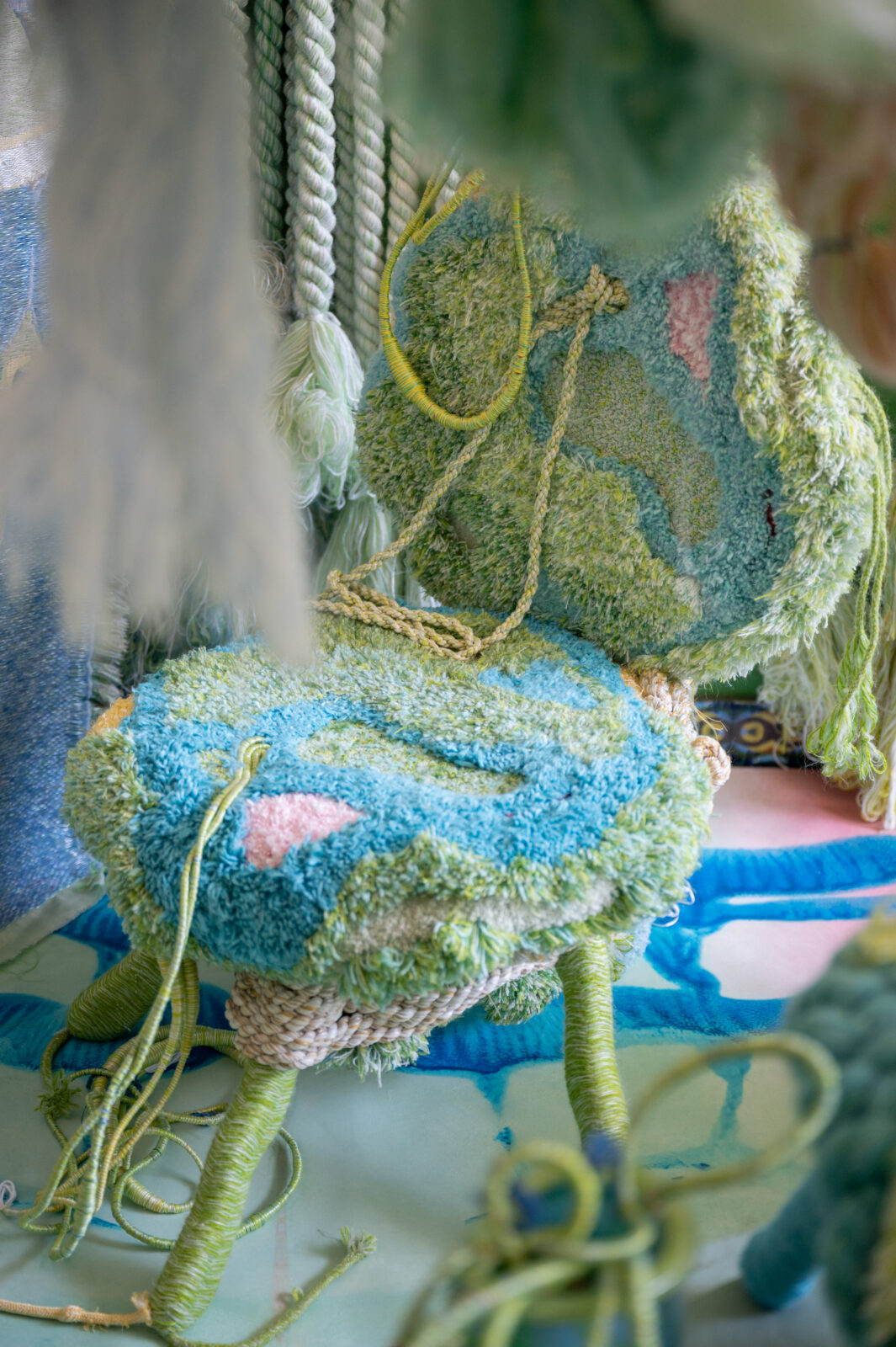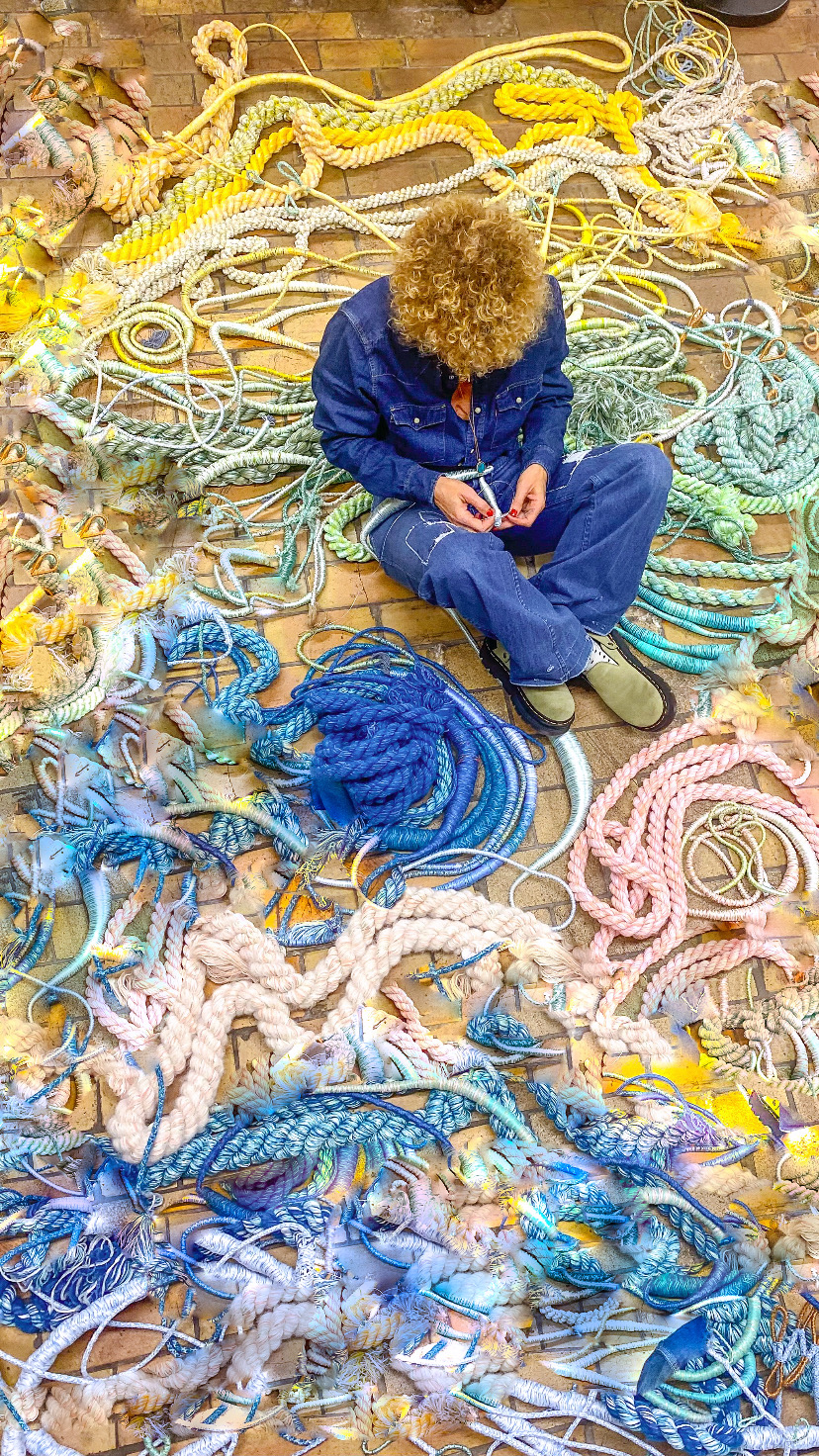 Voor Amsterdam Art Week ontwikkelde Sandra Keja Planken een grootschalige, interactieve installatie volledig gemaakt van restgarens. Het werk onderzoekt de relatie tussen mens, textiel en natuur en nodigt uit tot aanraking en interactie. Restgarens van katoen, wol, mohair en gerecycled PET zijn verwerkt tot ‘Nani Knots’, ‘Hanging Pillars’, ‘Dripping Corals’ en ‘Vesicularia Sculptures’, waarmee een kleurrijke, tactiele onderwaterwereld ontstaat. De kleuren zijn geïnspireerd op AI-renders en de technieken (gimpen, rondvlechten, koorddraaien en tuften) geven de objecten een organische, levendige structuur. Kleine restjes worden volledig hergebruikt, waardoor geen materiaal verloren gaat.