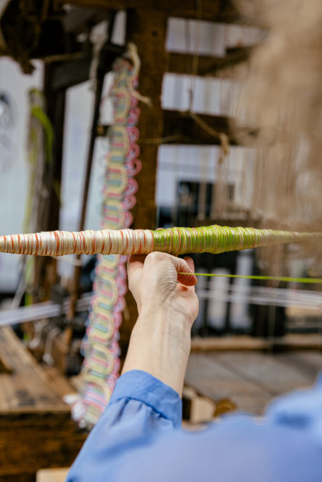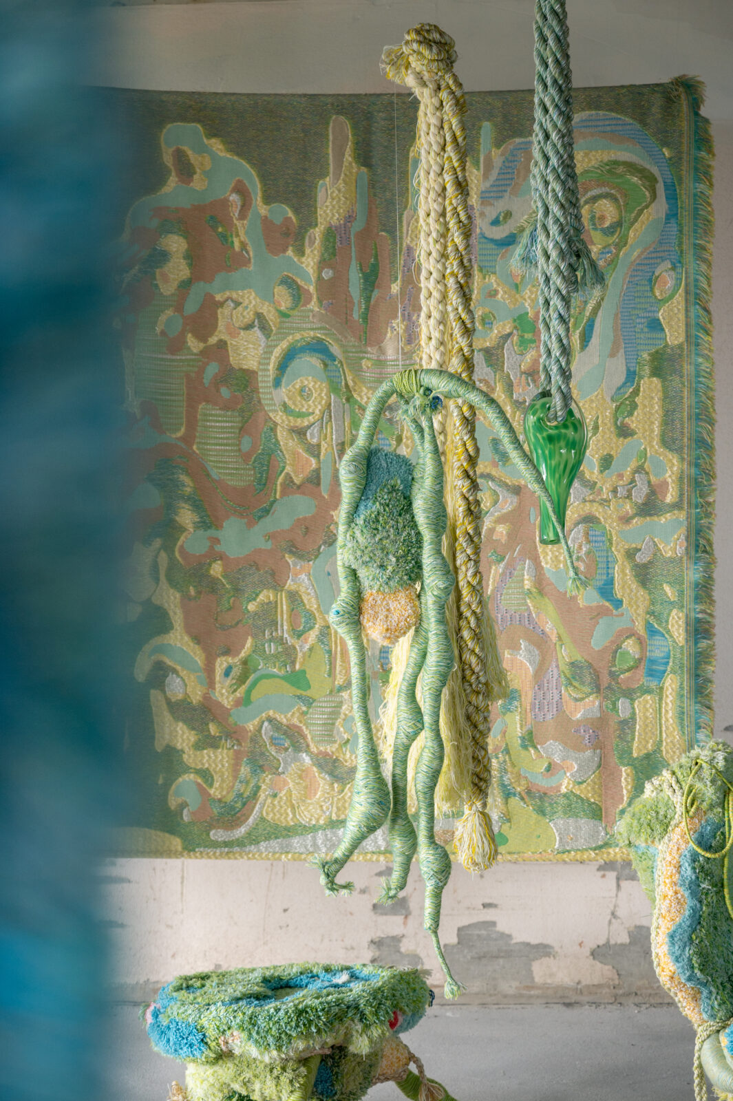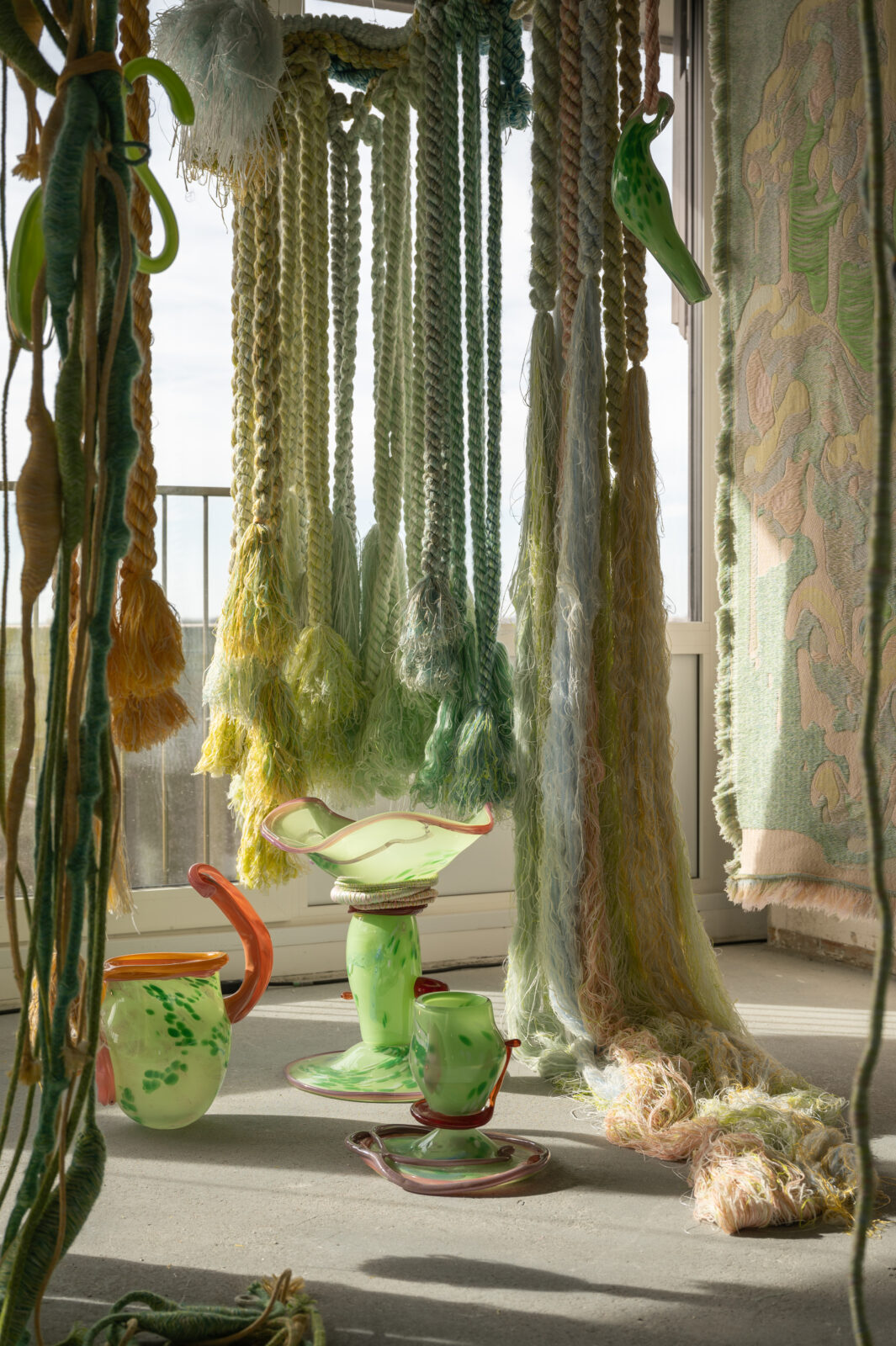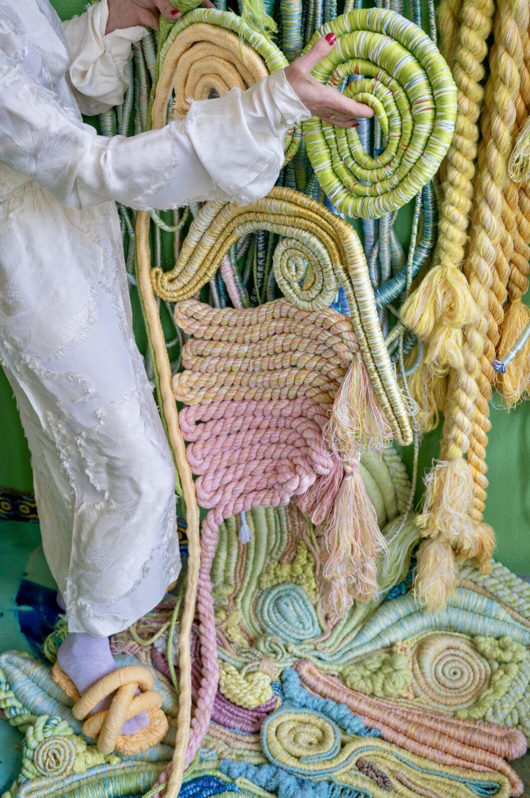 Voor Amsterdam Art Week ontwikkelde Sandra Keja Planken een grootschalige, interactieve installatie volledig gemaakt van restgarens. Het werk onderzoekt de relatie tussen mens, textiel en natuur en nodigt uit tot aanraking en interactie. Restgarens van katoen, wol, mohair en gerecycled PET zijn verwerkt tot ‘Nani Knots’, ‘Hanging Pillars’, ‘Dripping Corals’ en ‘Vesicularia Sculptures’, waarmee een kleurrijke, tactiele onderwaterwereld ontstaat. De kleuren zijn geïnspireerd op AI-renders en de technieken (gimpen, rondvlechten, koorddraaien en tuften) geven de objecten een organische, levendige structuur. Kleine restjes worden volledig hergebruikt, waardoor geen materiaal verloren gaat.