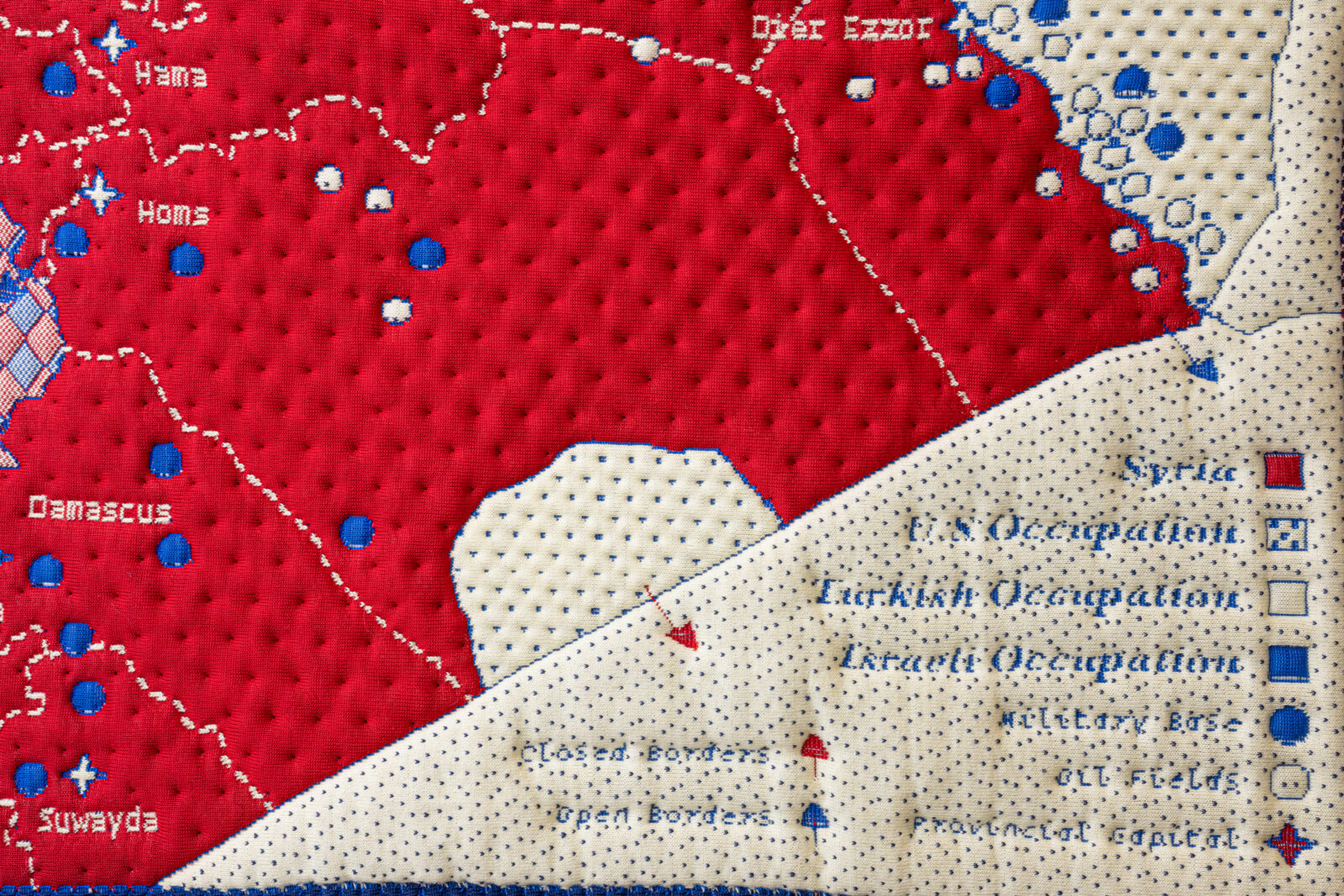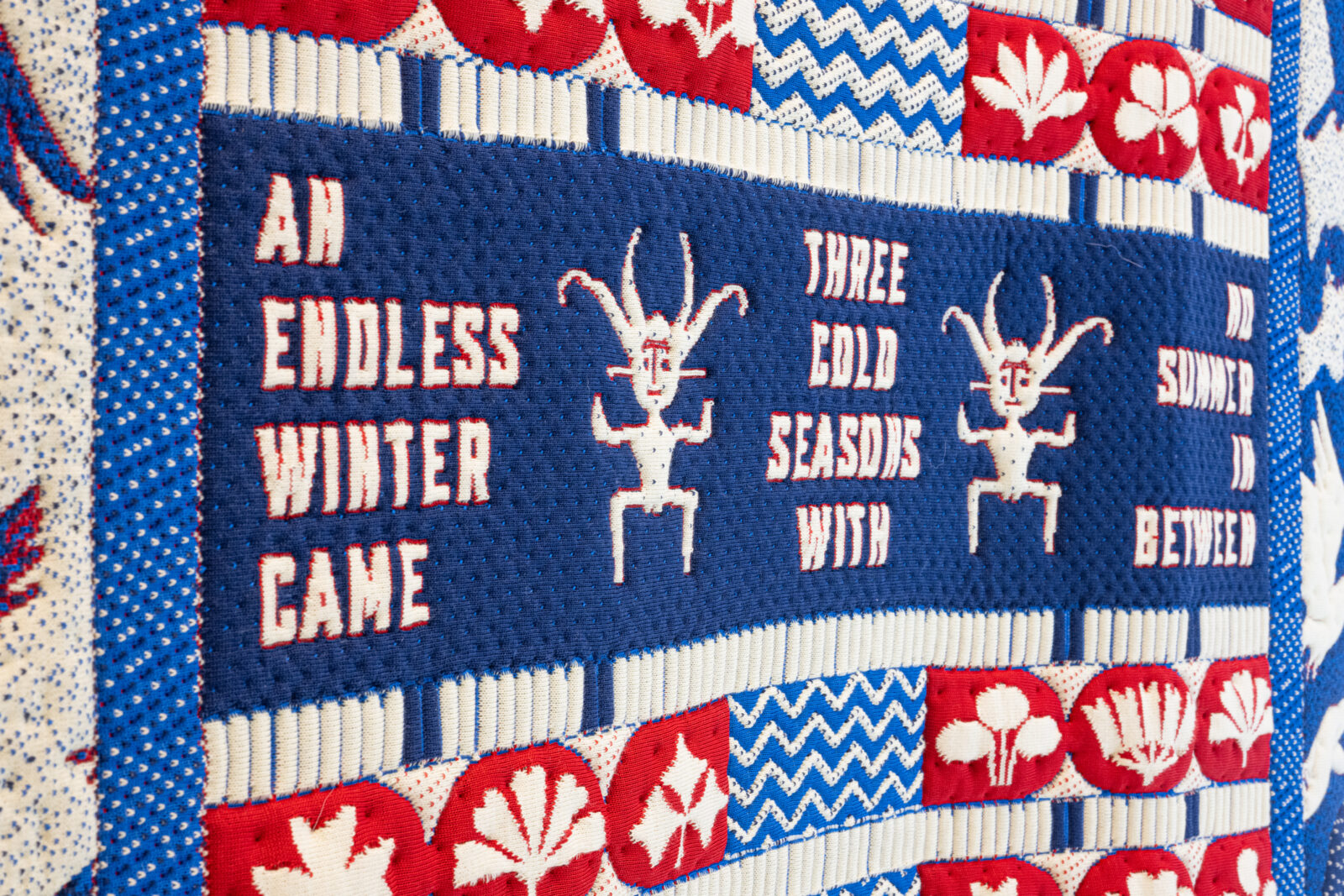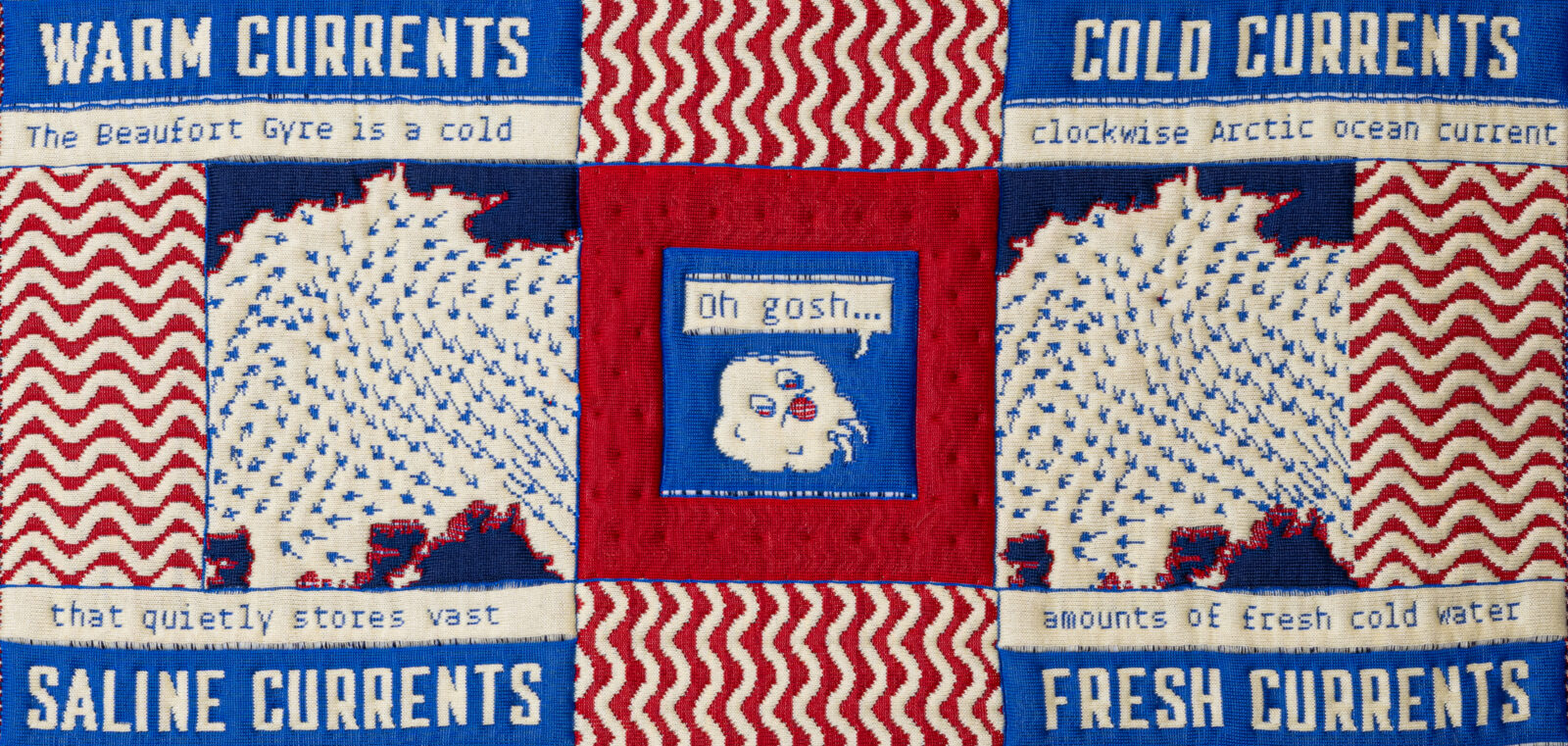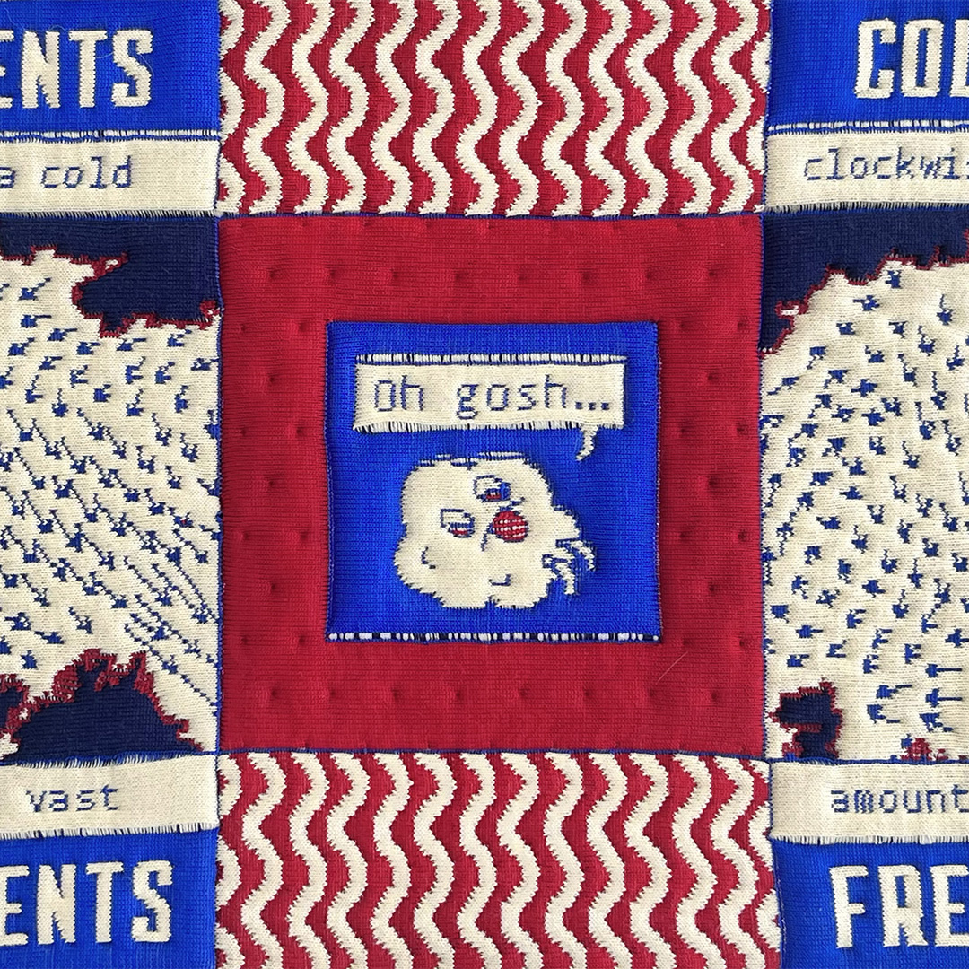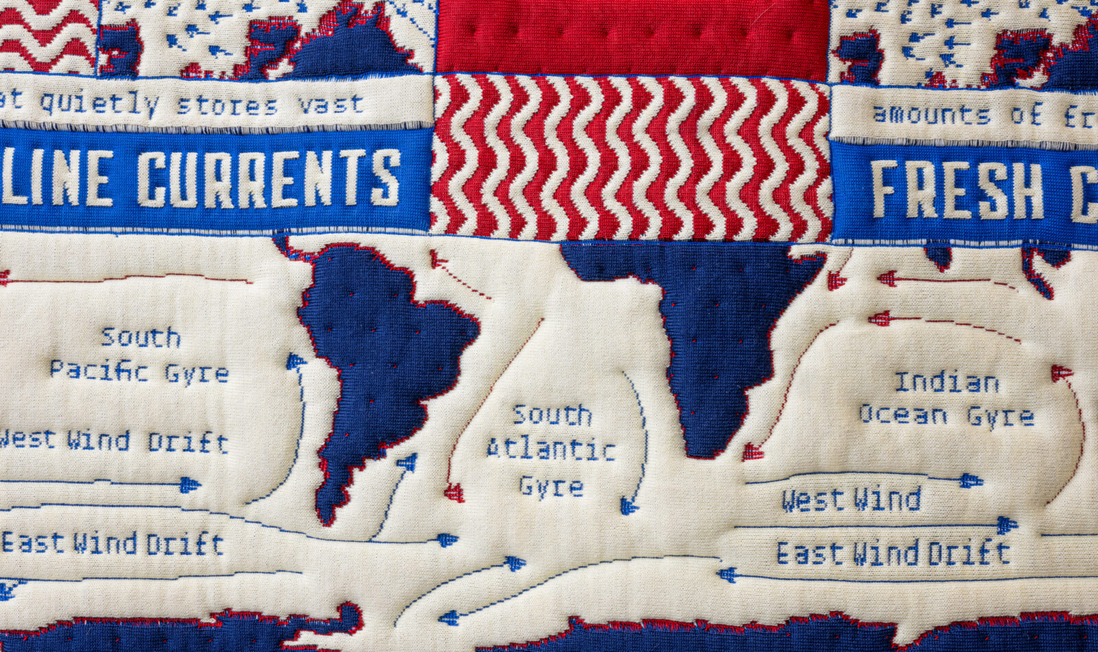 Het werk combineert symbolen, typografieën en schaduweffecten in een rijk patroon, waarbij de leesbaarheid van zelfontworpen letters zorgvuldig is getest tijdens het maakproces. Door gebruik van de dubbeldoek rondbreitechniek met vier kleuren en biologische materialen ontstaat een duurzaam en tactiel resultaat dat traditionele textieltechnieken inzet als vorm van kritiek op technologische vooruitgang en klimaatverandering.