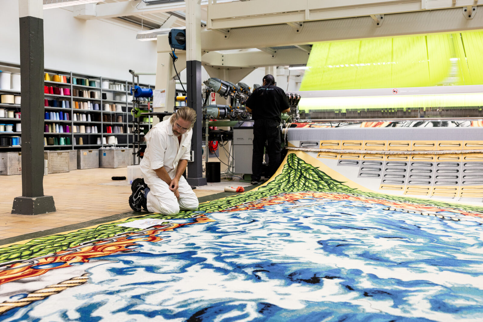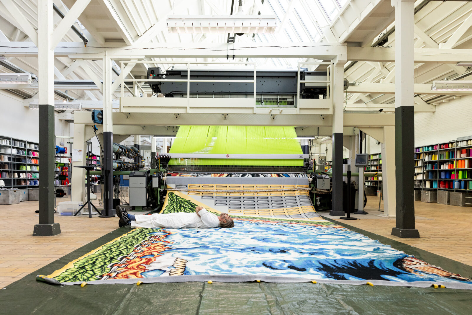 Het project ‘Huis van Delft’ van Studio Job verweeft de geschiedenis van Delft als een rode draad in een dynamisch en meeslepend geheel. Het werk strekt zich uit over drie verschillende zalen, waarvan in twee zalen werken zijn ontwikkeld in samenwerking met het TextielLab, en beslaat in totaal zo’n 240 strekkende meter geweven textiel.