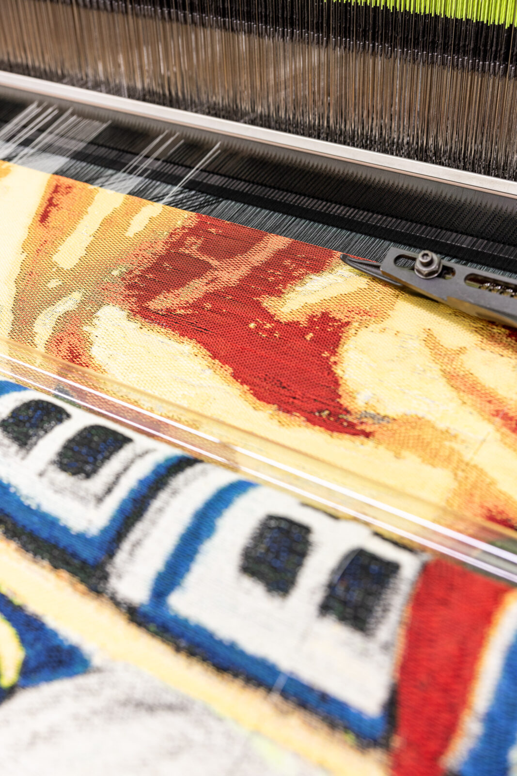 De ruimtelijke uitwerking van dit concept ontvouwt zich in meerdere zalen. In de Johannes Vermeer-zaal is een Jacquard-geweven draperie te zien, geïnspireerd op Vermeers schilderkunst, uitvergroot en getransformeerd tot een driedimensionaal, opgevuld weefsel. In dezelfde ruimte loopt een brug, waaronder een geweven ‘snelweg’ ligt die deels door een bulldozer lijkt te zijn opgekreukeld.